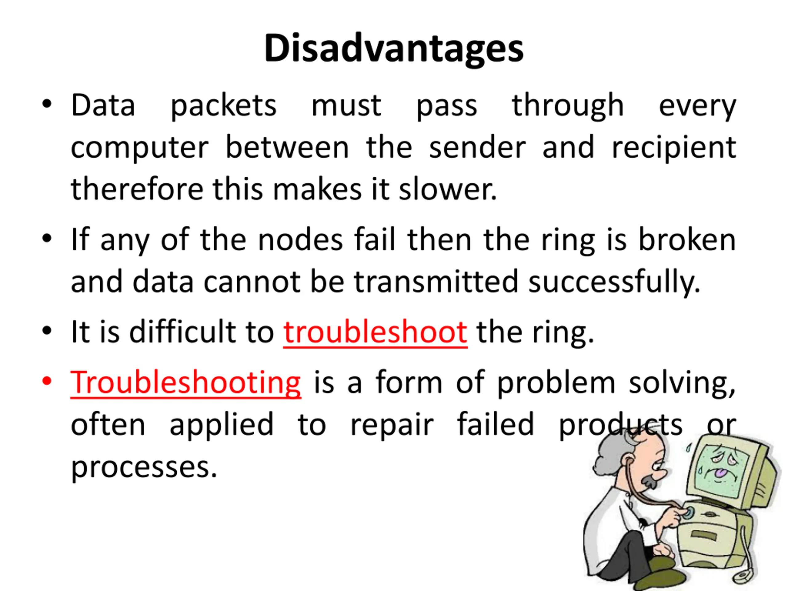 Disadvantages Data packets must pass through every computer between the sender and recipient therefore this makes it slower. If any of the nodes fail then the ring is broken and data cannot be transmitted successfully. It is difficult to troubleshoot the ring. Troubleshooting is a form of problem solving, often applied to repair failed products or processes.