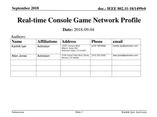 January 2015 doc.: IEEE 802.11-15/0061r6 References [1] Saroj Kar, Windows Azure: The power behind upcoming game Titanfall for the Xbox One , Silicon Angle February 25th, 2014 ; http://siliconangle.com/blog/2014/02/25/windows-azure-the-power- behind-blockbuster-game-titanfall-for-the-xbox-one/ [2] Mark Claypool, David LaPoint, and Josh Winslow. Network Analysis of Counter-strike and Starcraft ,InProceedings of the 22nd IEEE International Performance, Computing, and Communications Conference (IPCCC), Phoenix, Arizona, USA, April 2003 [3] Amit Sinha, Kenneth Mitchell, Deep Medhi Network Game Traffic: A Broadband Access Perspective , Computer Networks, vol. 49, no. 1, pp. 71-83, 2005 [4] L. Pantel, L. Wolf, On the impact of delay on real-time multiplayer games , Proc. International Workshop on Network and Operating System Support for Digital Audio and Video (NOSSDAV) (2002) 23-29 [5] Tristan Henderson, Saleem Bhatti Networked games A QoS sensitive application for QoS insensitive users? , ACM SIGCOMM 2003 Workshops August 25 & 27, 2003, Karlsruhe, Germany [6] Rahul Amin, France Jackson, Juan Gilbert, Jim Martin Assessing the Impact of Latency and Jitter on the Perceived Quality of Call of Duty Modern Warfare 2 , In HCI'13 Proceedings of the 15th international conference on Human-Computer Interaction: users and contexts of use - Volume Part III Pages 97-106, (2013) [7] Kjetil Raaen, Latency Thresholds for Usability in Games , NIK-2014 conference (2014) [8] Mark Claypool, Kajal Claypool, Latency Can Kill: Precision and Deadline in Online Games , February 22 23, 2010, Phoenix, Arizona, USA. [9] J. F rber, Network game traffic modelling, in Proceedings of Netgames, April 2002, pp. 53 57. Submission Slide 19 Allan Jones, Activision