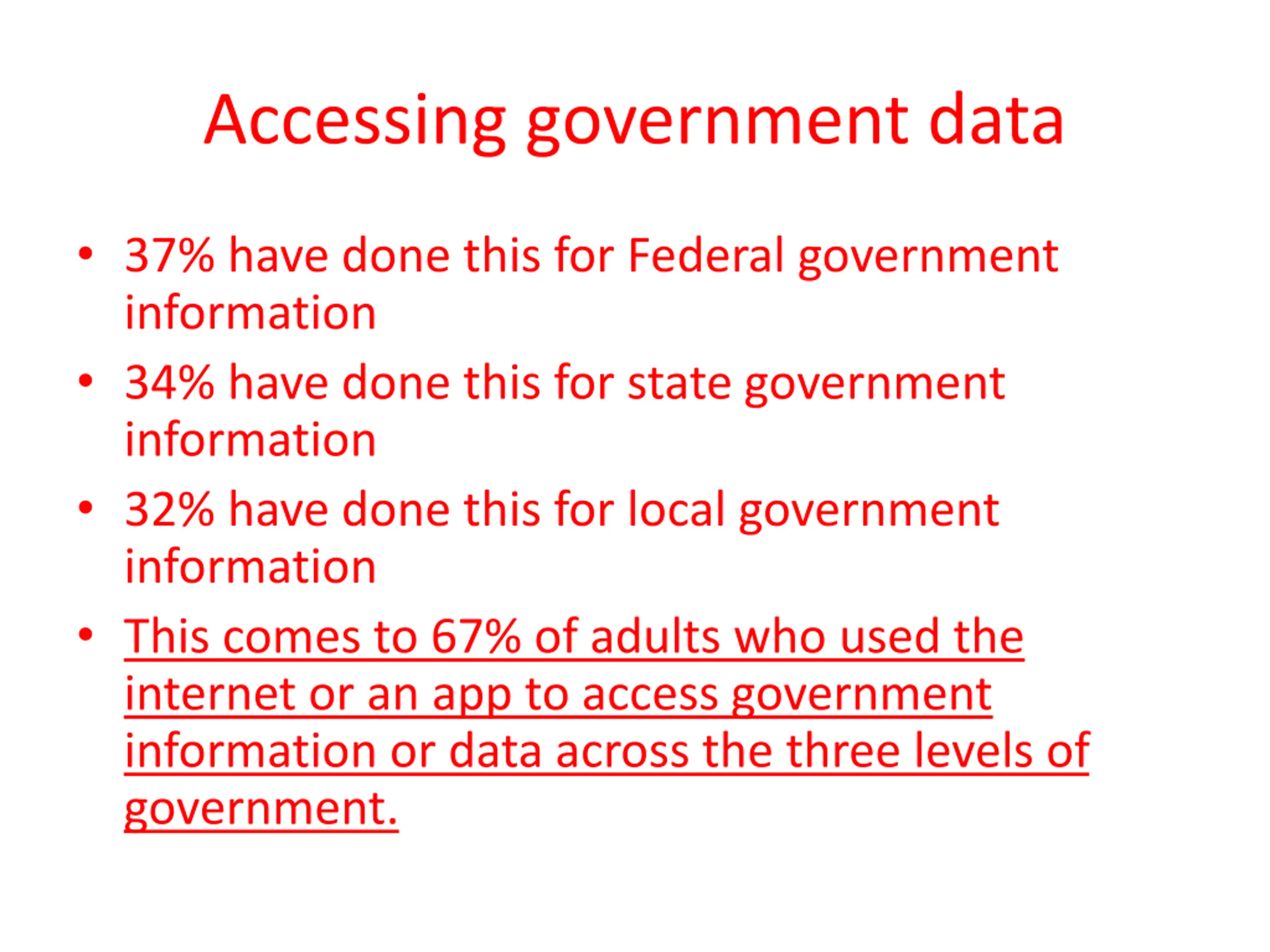 Accessing government data 37% have done this for Federal government information 34% have done this for state government information 32% have done this for local government information This comes to 67% of adults who used the internet or an app to access government information or data across the three levels of government.