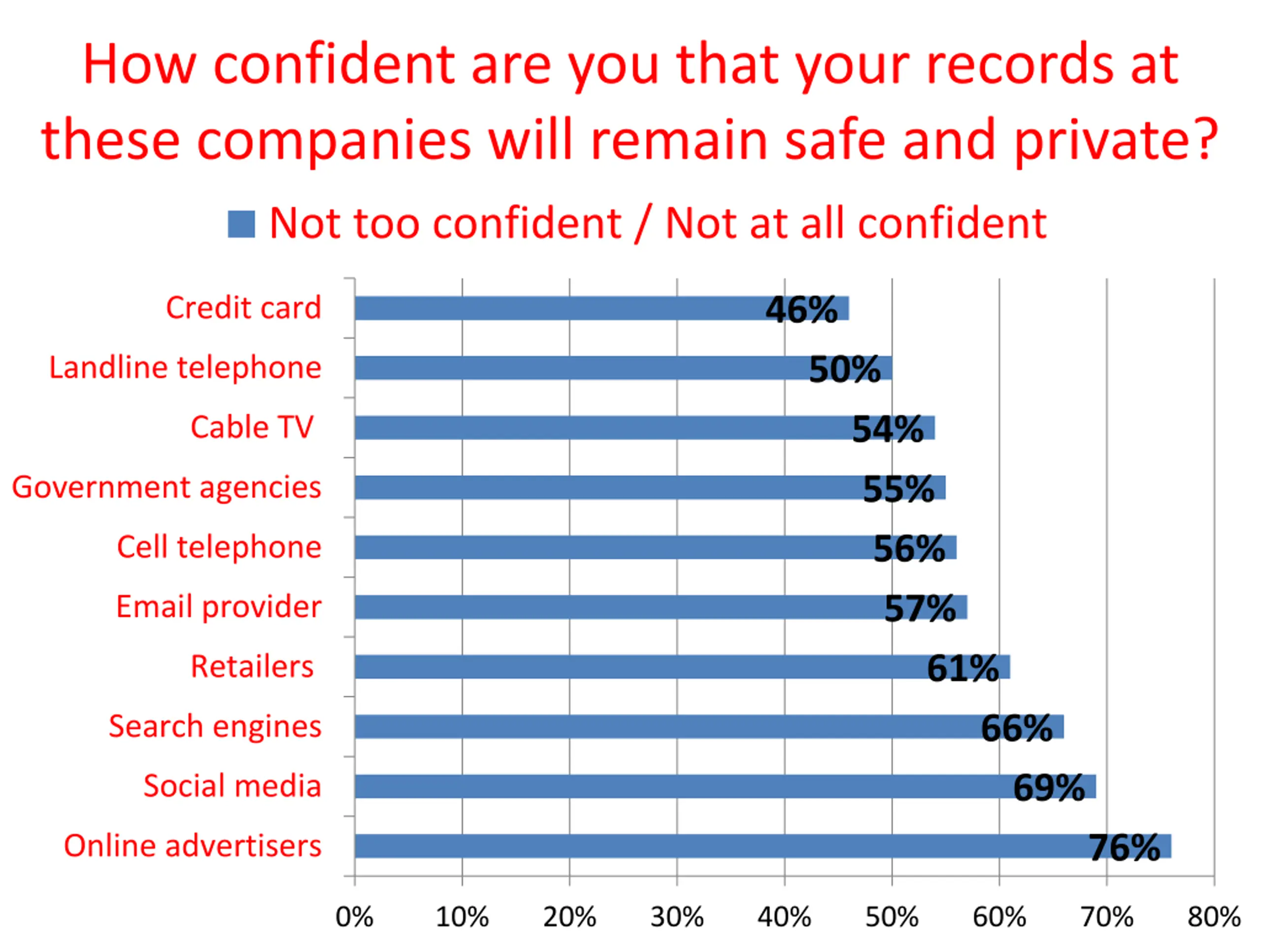 How confident are you that your records at these companies will remain safe and private? Not too confident / Not at all confident 46% Credit card 50% Landline telephone 54% Cable TV 55% Government agencies 56% Cell telephone 57% Email provider 61% Retailers 66% Search engines 69% Social media 76% Online advertisers 0% 10% 20% 30% 40% 50% 60% 70% 80%