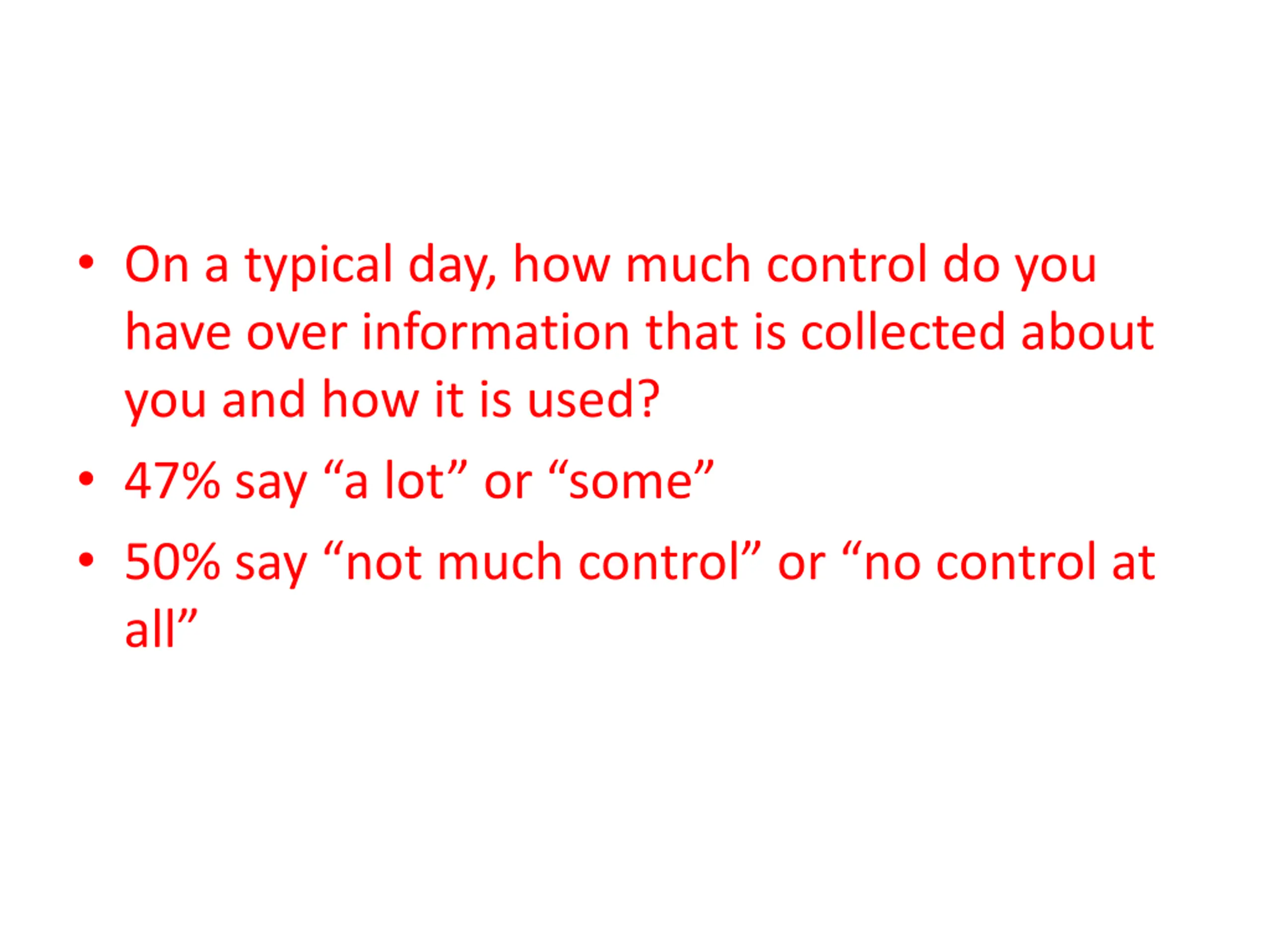 On a typical day, how much control do you have over information that is collected about you and how it is used? 47% say a lot or some 50% say not much control or no control at all