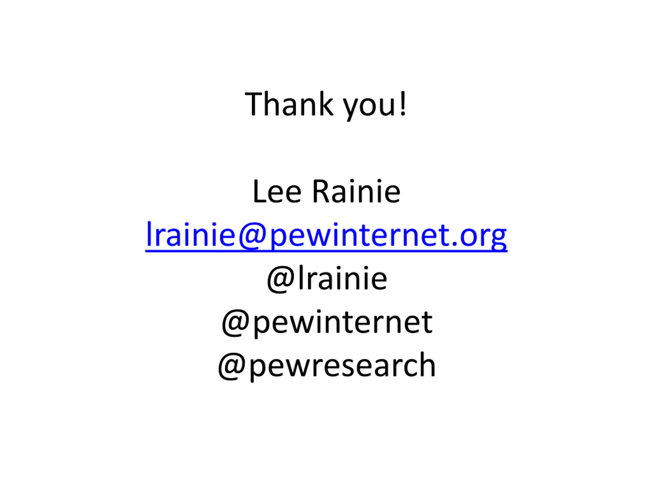Thank you! Lee Rainie lrainie@pewinternet.org @lrainie @pewinternet @pewresearch