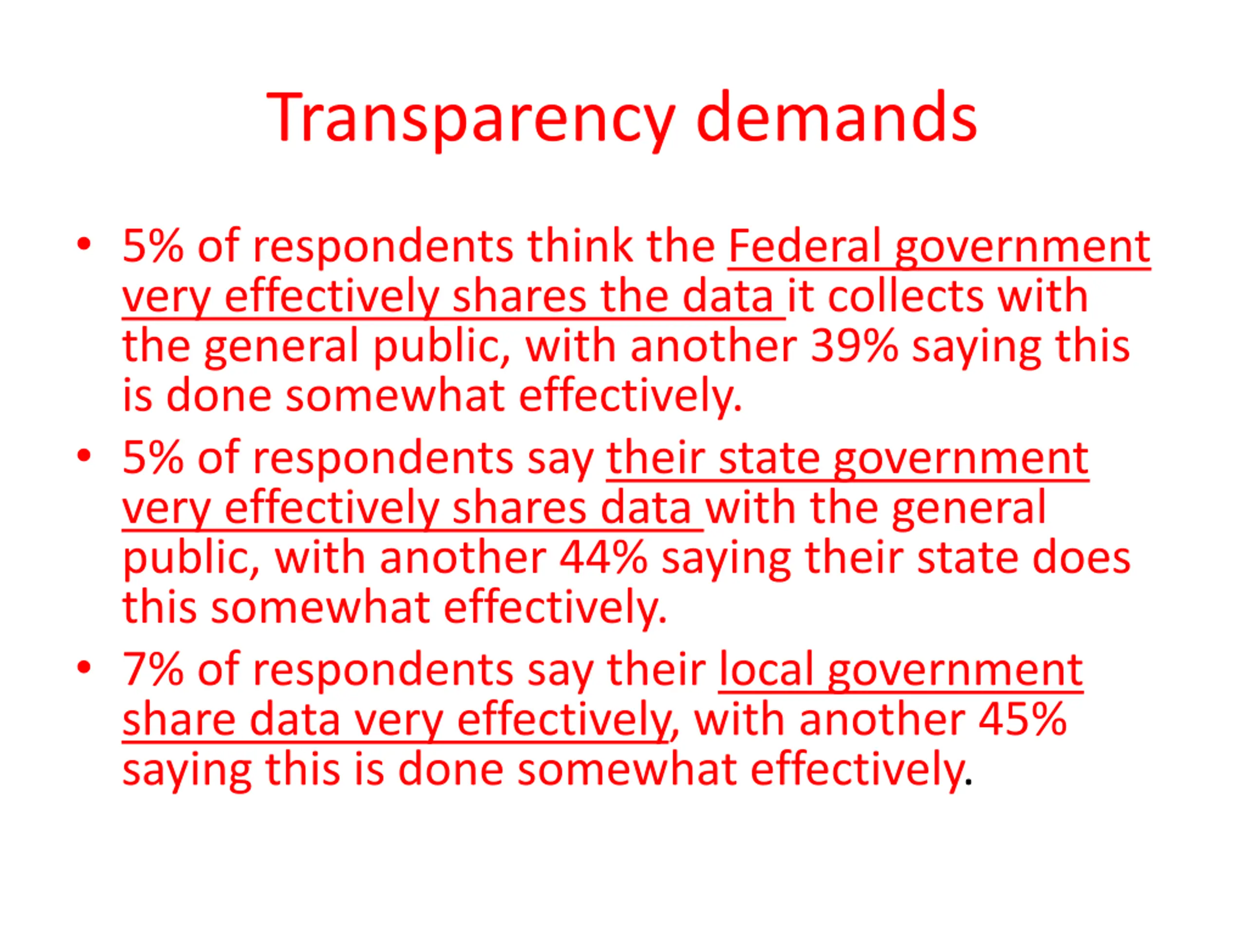 Transparency demands 5% of respondents think the Federal government very effectively shares the data it collects with the general public, with another 39% saying this is done somewhat effectively. 5% of respondents say their state government very effectively shares data with the general public, with another 44% saying their state does this somewhat effectively. 7% of respondents say their local government share data very effectively, with another 45% saying this is done somewhat effectively.