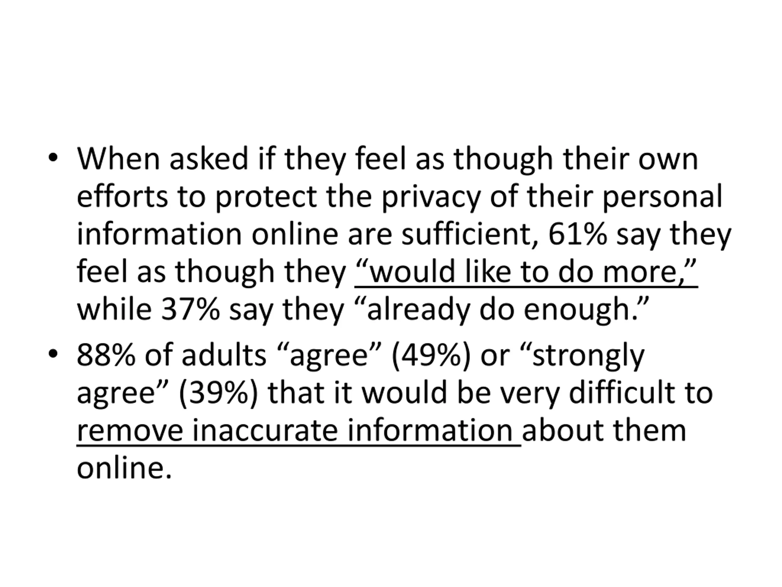 When asked if they feel as though their own efforts to protect the privacy of their personal information online are sufficient, 61% say they feel as though they would like to do more, while 37% say they already do enough. 88% of adults agree (49%) or strongly agree (39%) that it would be very difficult to remove inaccurate information about them online.