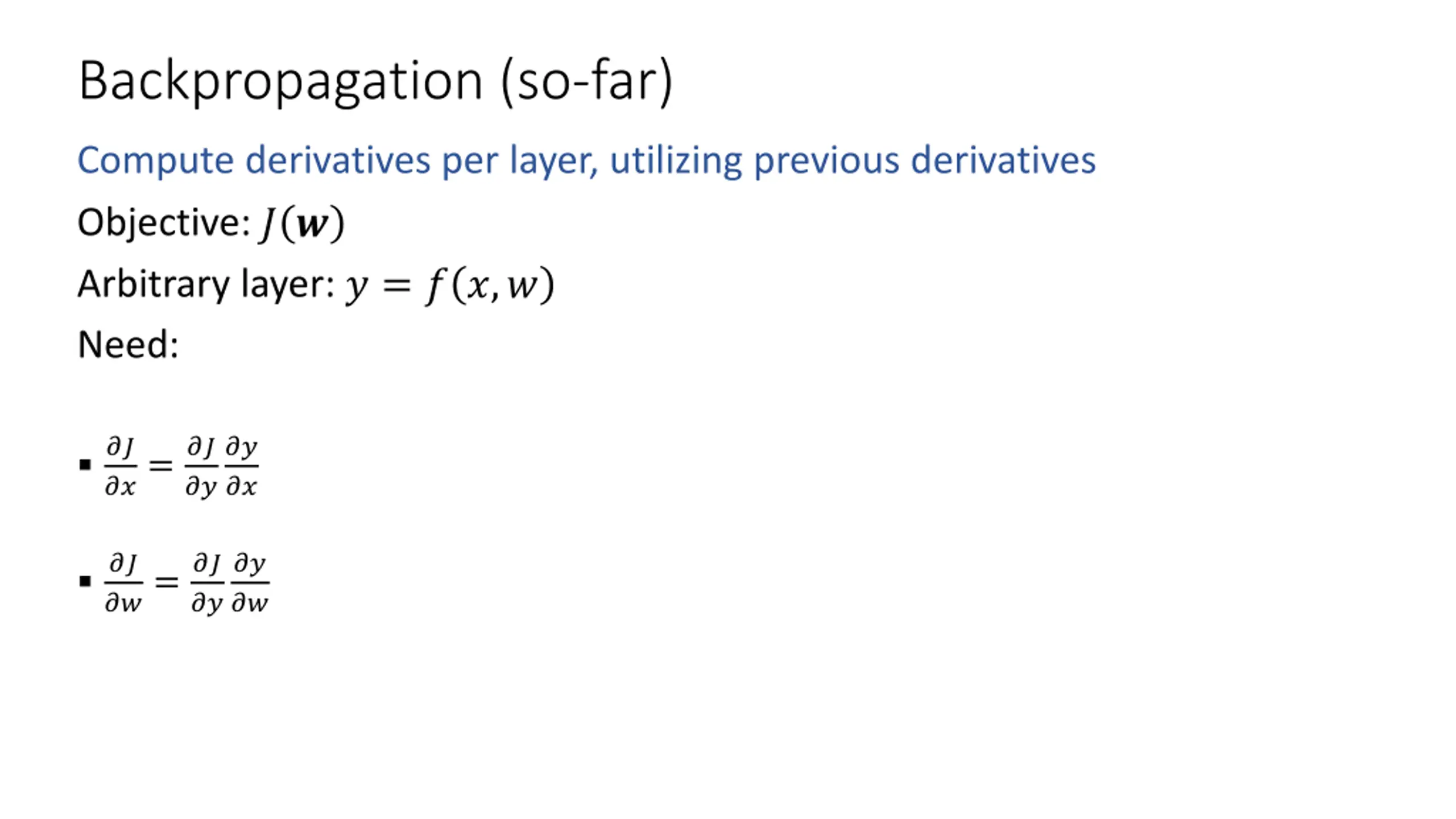 Backpropagation (so-far) Compute derivatives per layer, utilizing previous derivatives Objective: ? ? Arbitrary layer: ? = ? ?,? Need: ?? ??= ?? ?? ?? ?? ?? ??= ?? ?? ?? ??