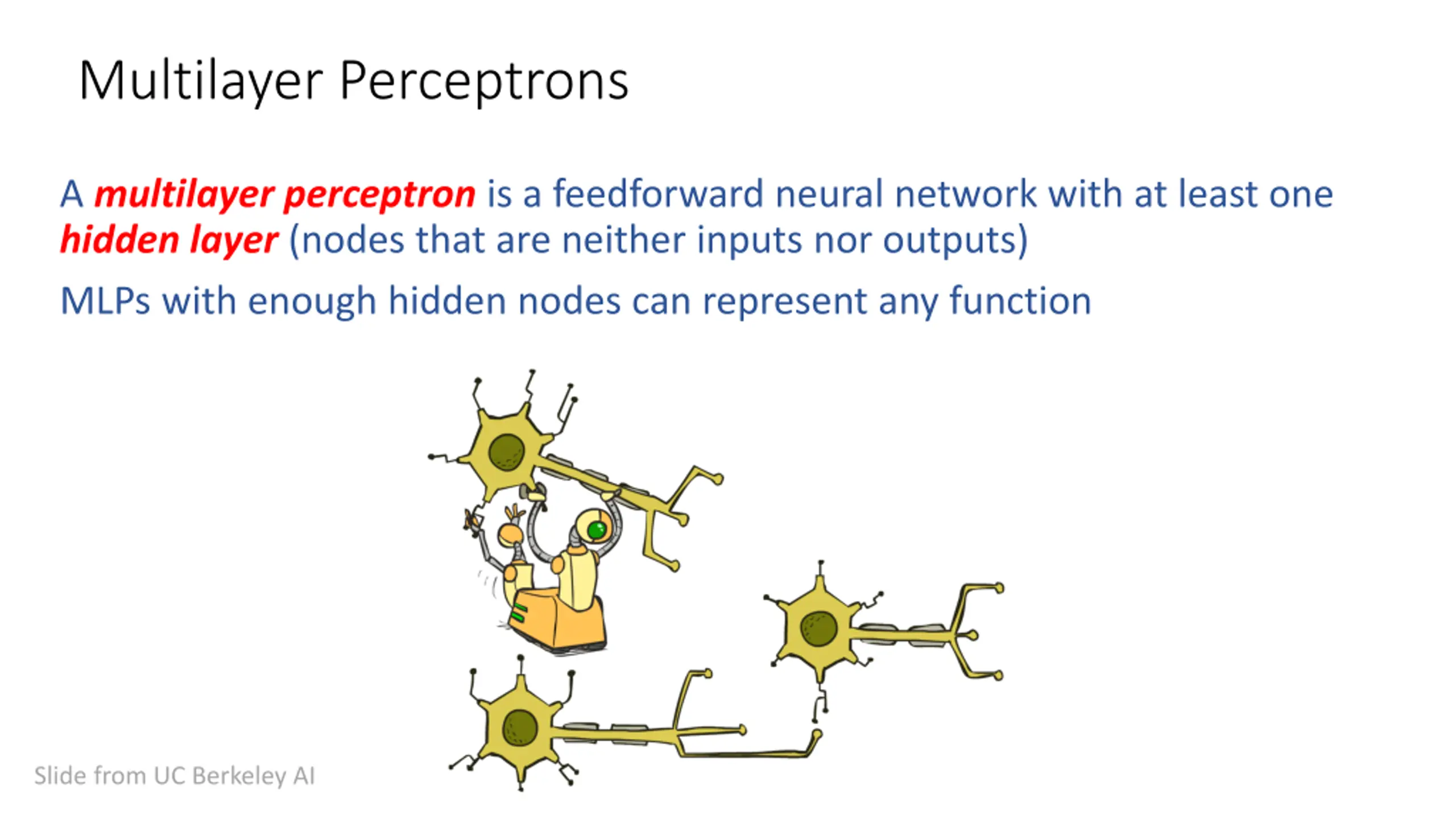 Multilayer Perceptrons A multilayer perceptron is a feedforward neural network with at least one hidden layer (nodes that are neither inputs nor outputs) MLPs with enough hidden nodes can represent any function Slide from UC Berkeley AI