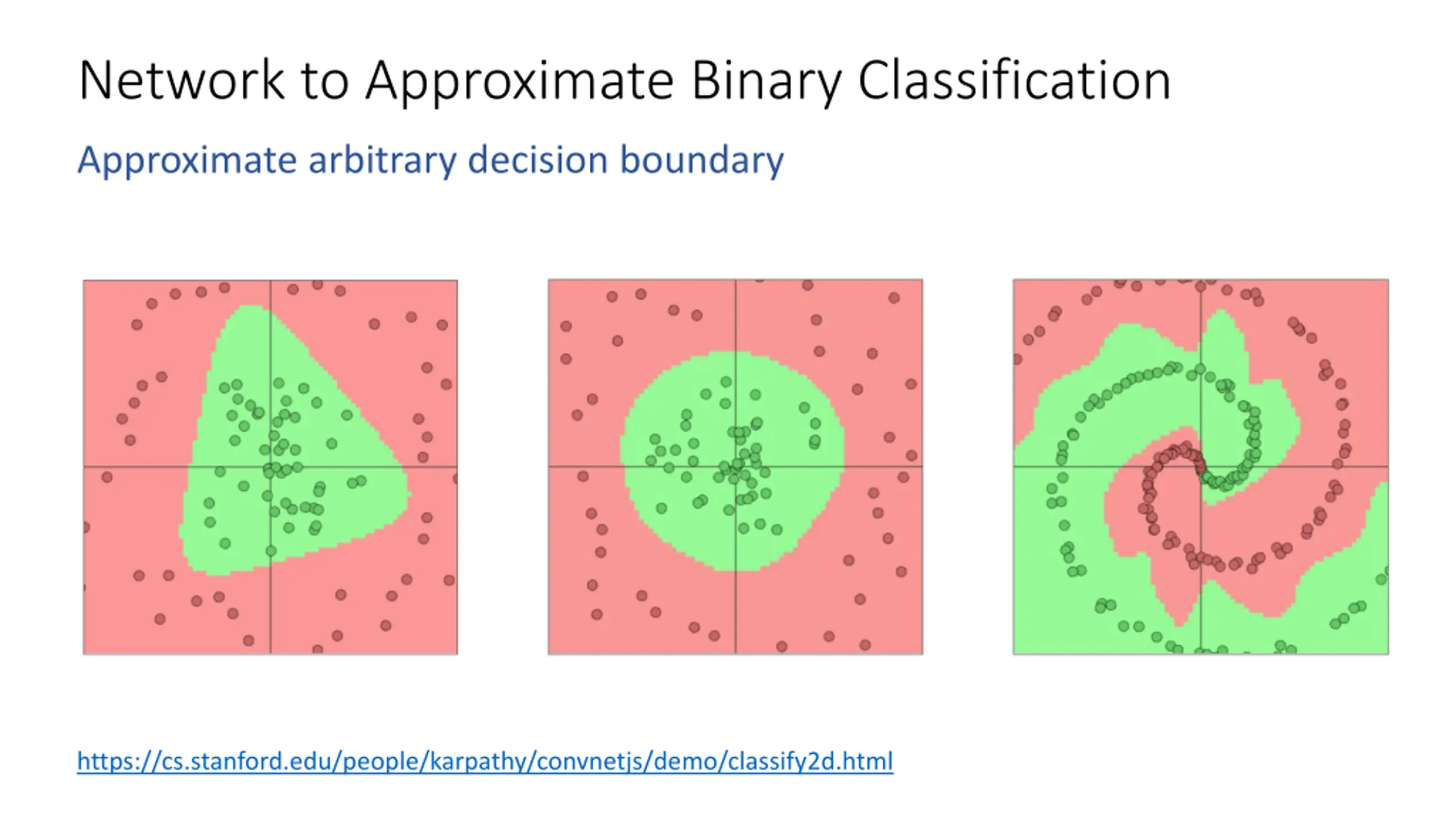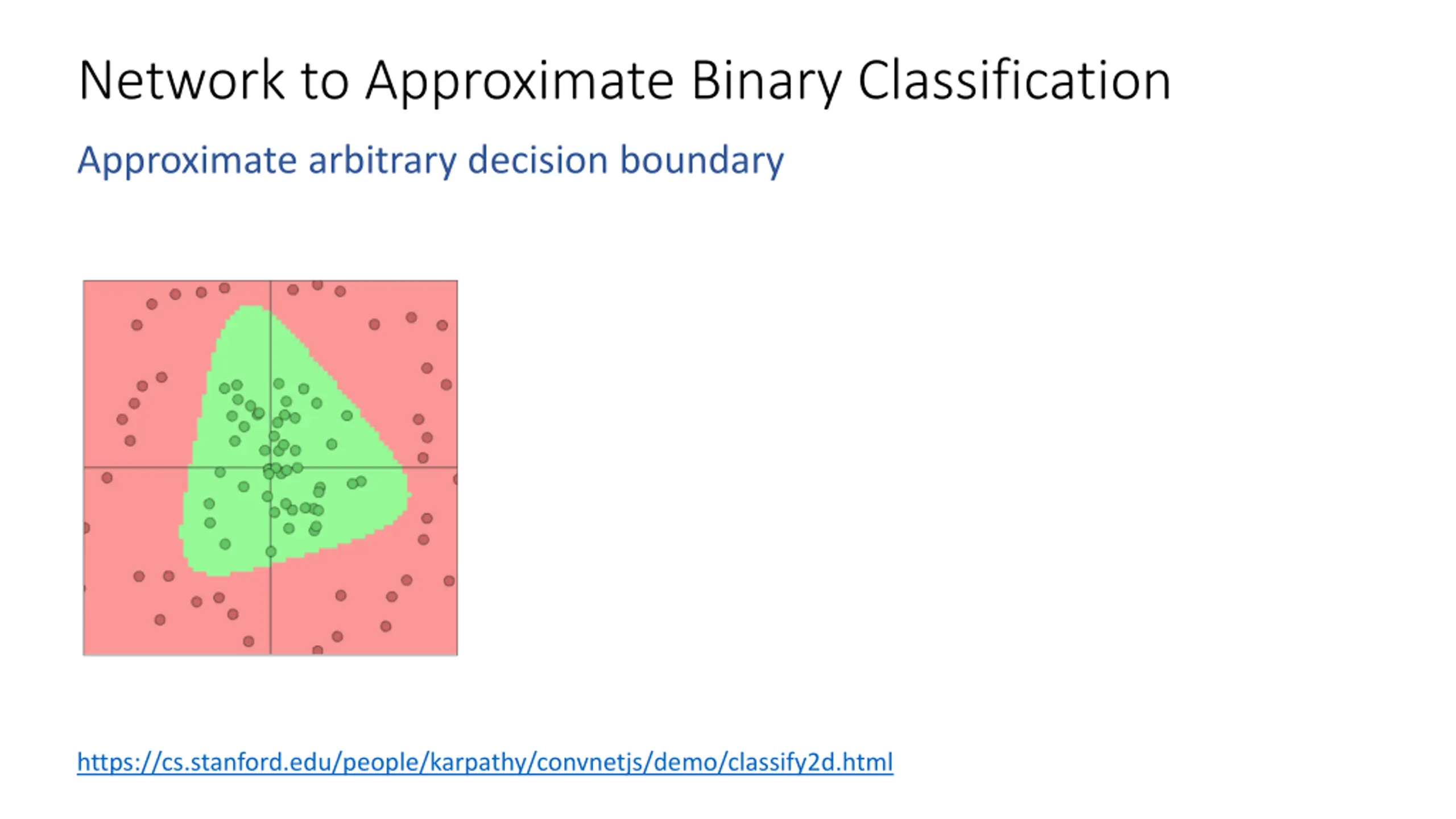 Network to Approximate Binary Classification Approximate arbitrary decision boundary https://cs.stanford.edu/people/karpathy/convnetjs/demo/classify2d.html
