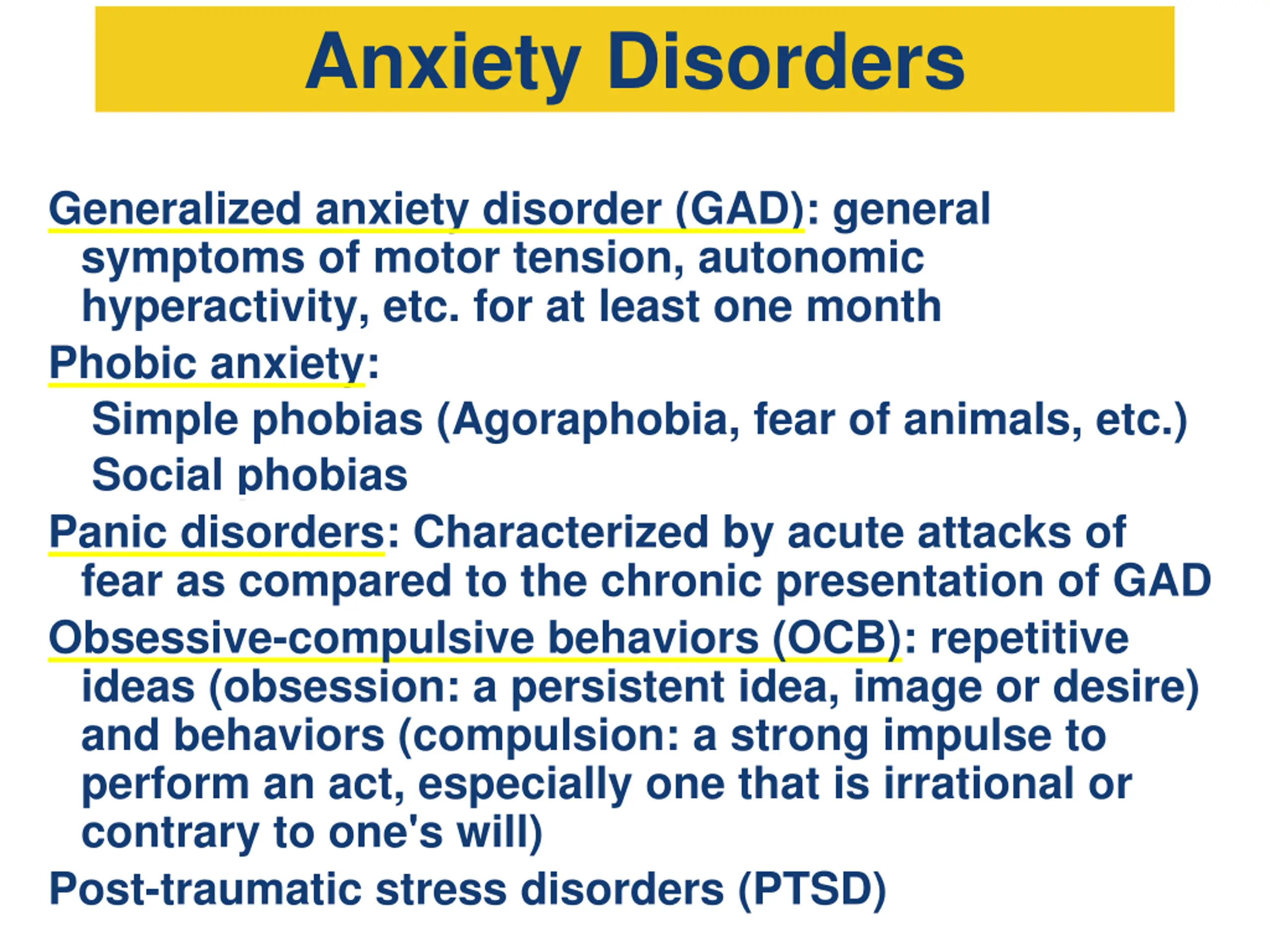 Anxiety Disorders Generalized anxiety disorder (GAD): general symptoms of motor tension, autonomic hyperactivity, etc. for at least one month Phobic anxiety: Simple phobias (Agoraphobia, fear of animals, etc.) Social phobias Panic disorders: Characterized by acute attacks of fear as compared to the chronic presentation of GAD Obsessive-compulsive behaviors (OCB): repetitive ideas (obsession: a persistent idea, image or desire) and behaviors (compulsion: a strong impulse to perform an act, especially one that is irrational or contrary to one's will) Post-traumatic stress disorders (PTSD)