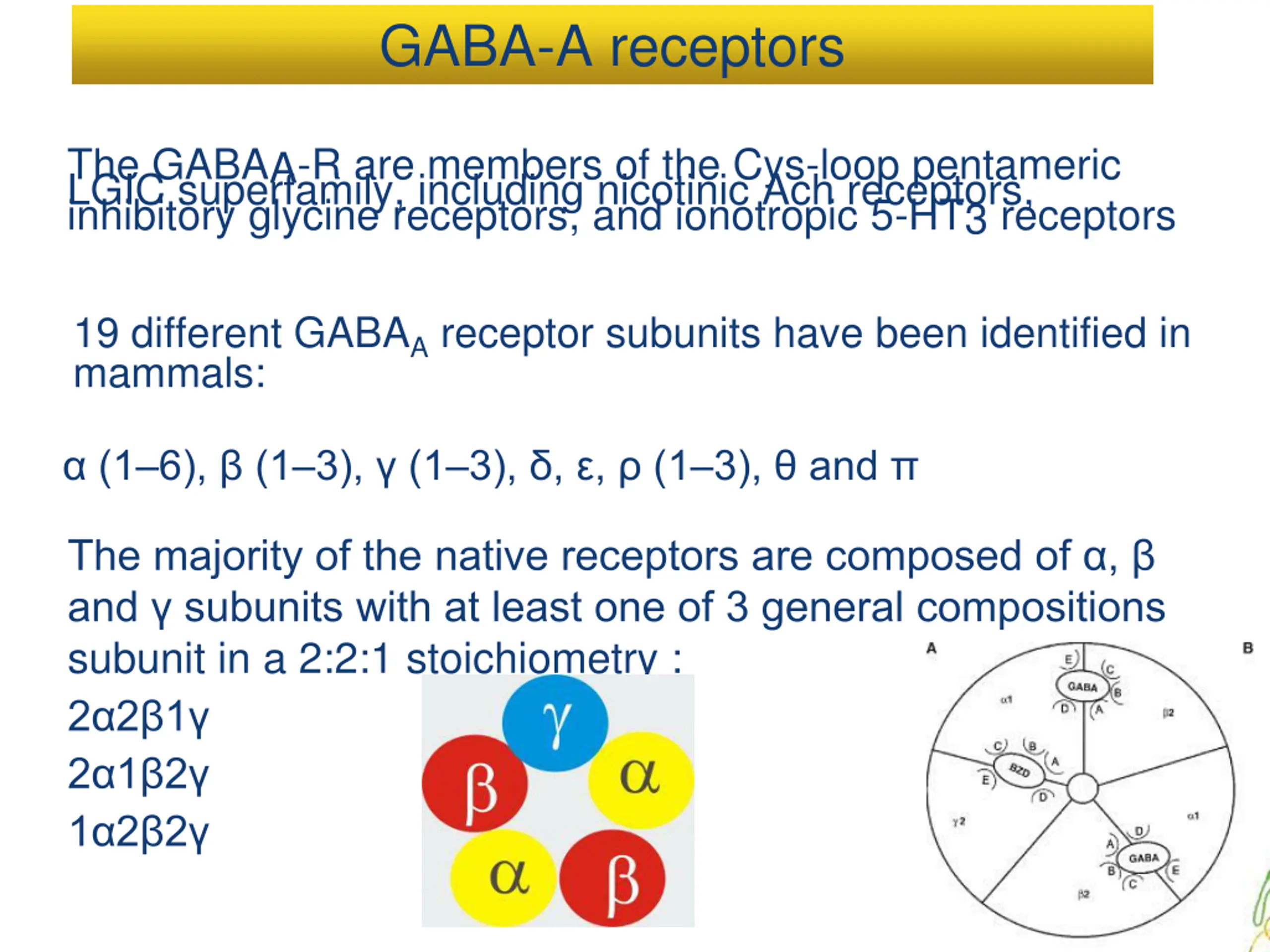 GABA-A receptors The GABAA-R are members of the Cys-loop pentameric LGIC superfamily, including nicotinic Ach receptors, inhibitory glycine receptors, and ionotropic 5-HT3 receptors 19 different GABAA receptor subunits have been identified in mammals: (1 6), (1 3), (1 3), , , (1 3), and The majority of the native receptors are composed of , and subunits with at least one of 3 general compositions subunit in a 2:2:1 stoichiometry : 2 2 1 2 1 2 1 2 2