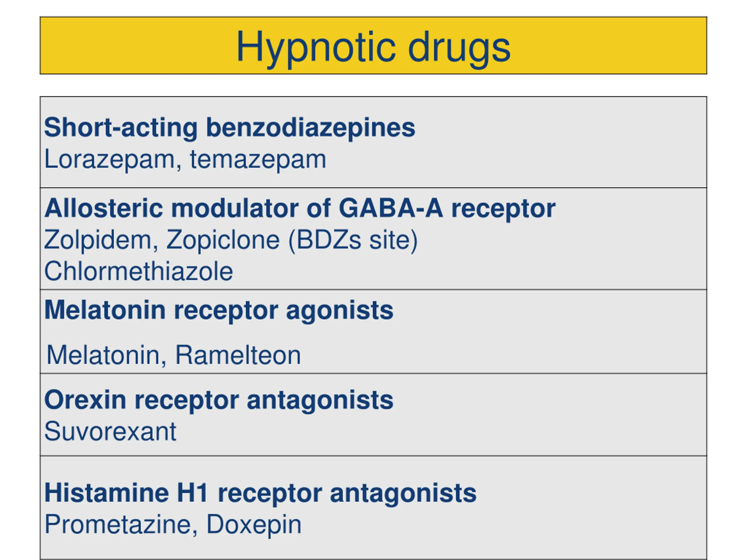 Hypnotic drugs Short-acting benzodiazepines Lorazepam, temazepam Allosteric modulator of GABA-A receptor Zolpidem, Zopiclone (BDZs site) Chlormethiazole Melatonin receptor agonists Melatonin, Ramelteon Orexin receptor antagonists Suvorexant Histamine H1 receptor antagonists Prometazine, Doxepin