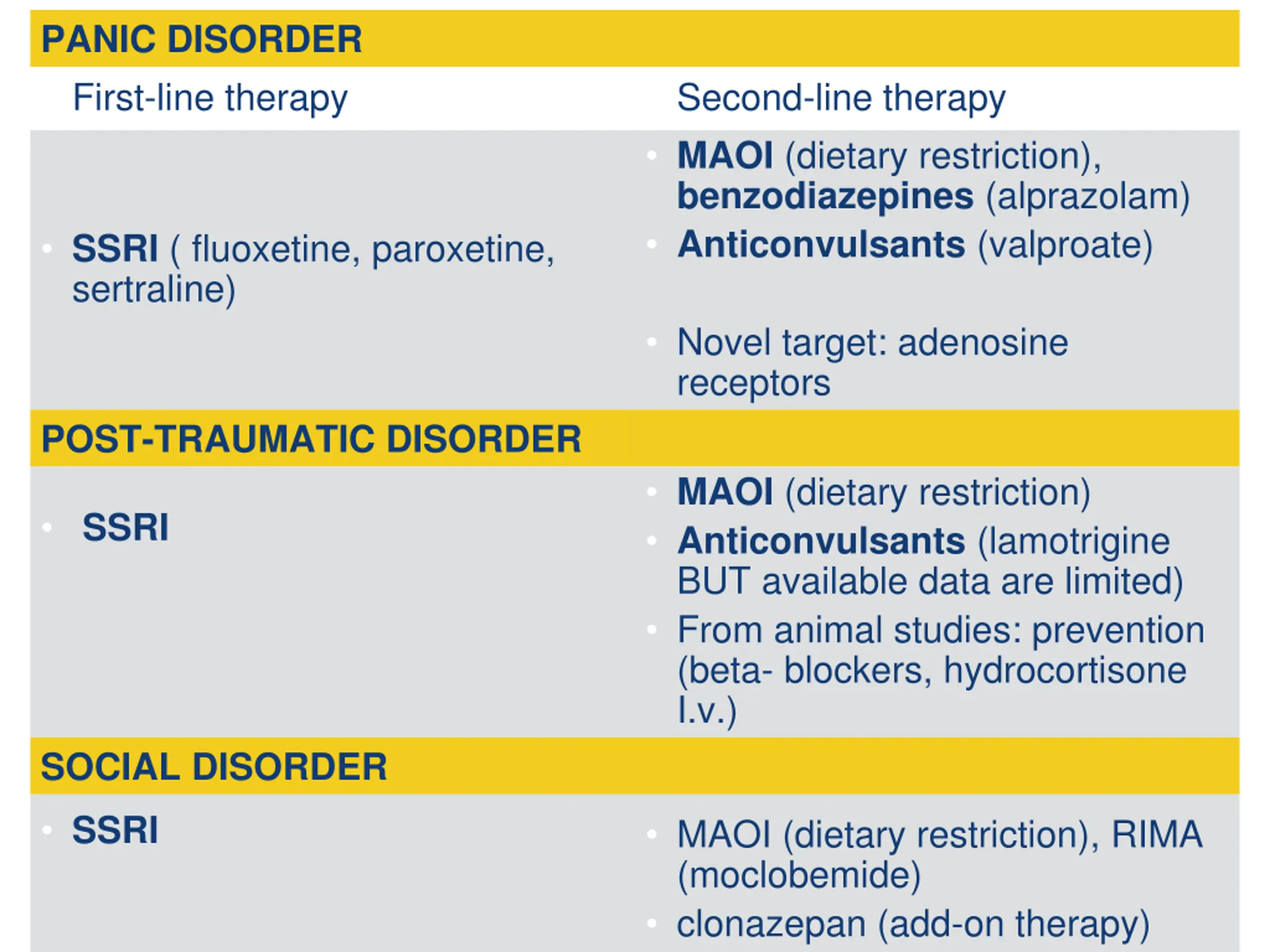 PANIC DISORDER First-line therapy Second-line therapy MAOI (dietary restriction), benzodiazepines (alprazolam) Anticonvulsants (valproate) SSRI ( fluoxetine, paroxetine, sertraline) Novel target: adenosine receptors POST-TRAUMATIC DISORDER MAOI (dietary restriction) Anticonvulsants (lamotrigine BUT available data are limited) From animal studies: prevention (beta- blockers, hydrocortisone I.v.) SSRI SOCIAL DISORDER SSRI MAOI (dietary restriction), RIMA (moclobemide) clonazepan (add-on therapy)