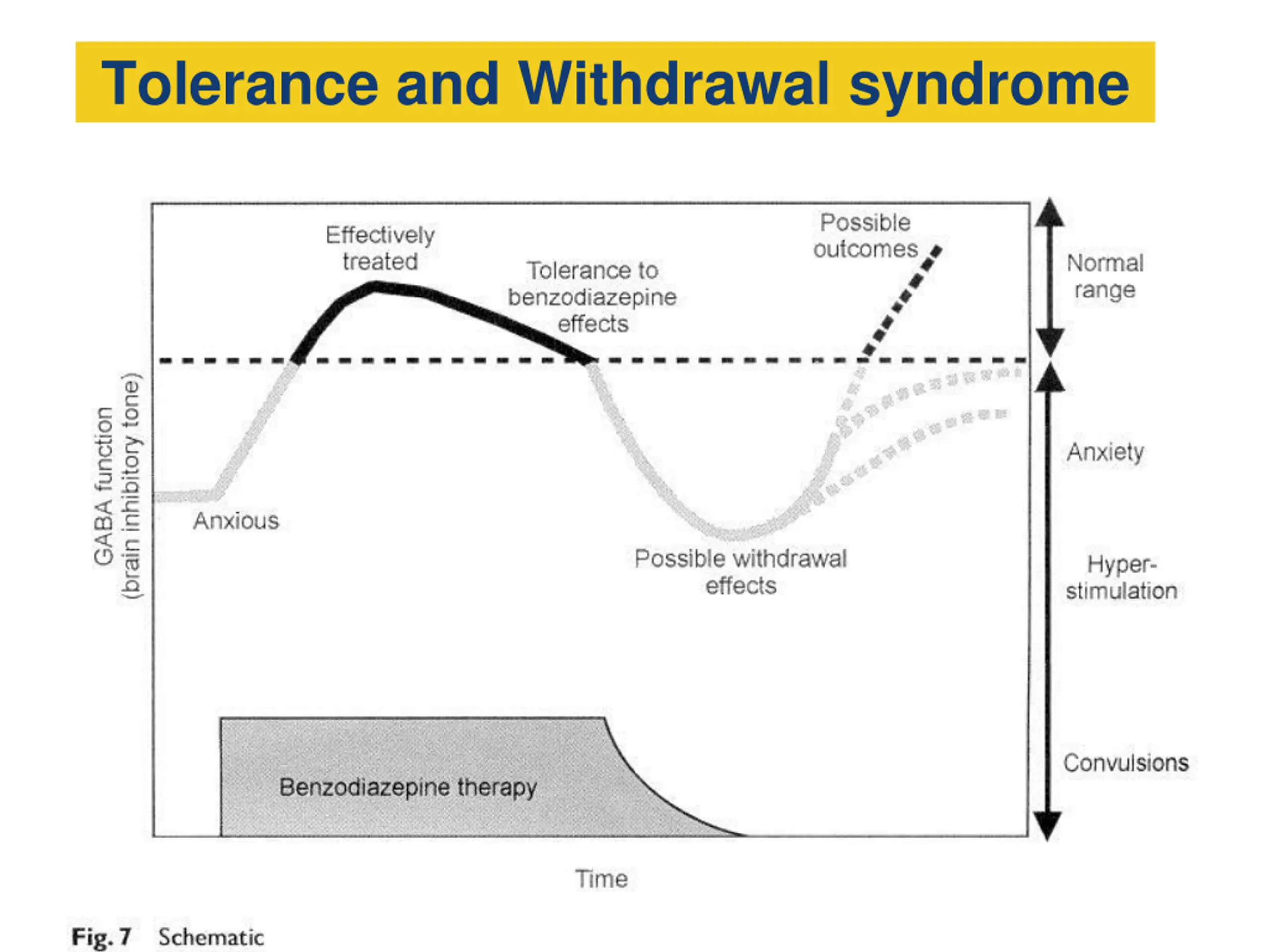 Side Effects of Benzodiazepines BDZs have a wide margin of safety if used for short periods Long-term use (> 2 weeks) increases risk for adverse effects: Misuse, abuse, dependence Motor impairment (reaction time) Cognitive impairment (sedation, amnesia) Pharmacodinamic drug interactions with other CNS depressants (alcohol, other anxiolytic drugs, OTC antihistaminic and anticholinergic drugs) Pharmacokineticdrug interactions with SSRI s and oral contraceptives (decrease metabolism of BDZs) Withdrawal syndrome