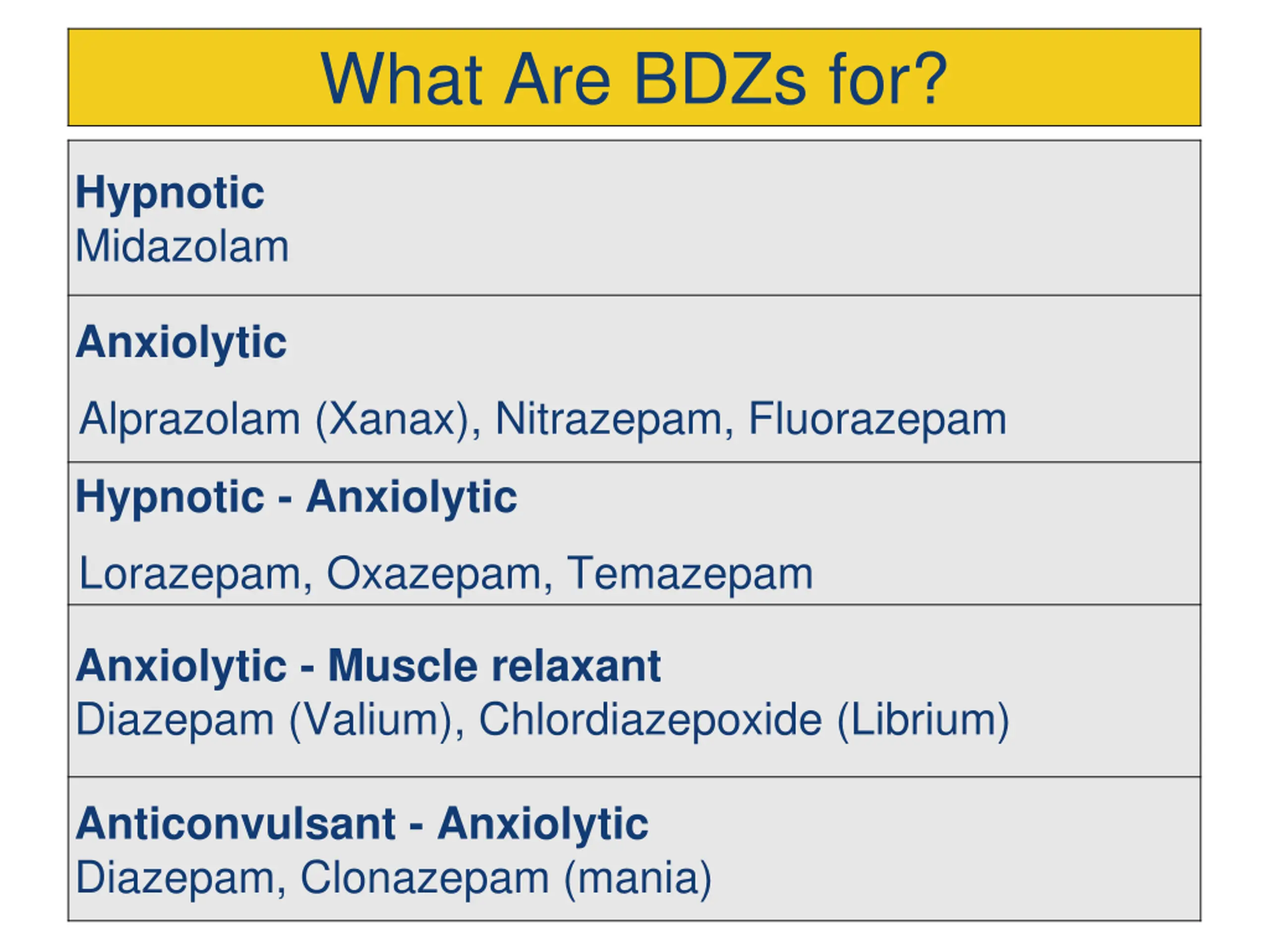 What Are BDZs for? Hypnotic Midazolam Anxiolytic Alprazolam (Xanax), Nitrazepam, Fluorazepam Hypnotic - Anxiolytic Lorazepam, Oxazepam, Temazepam Anxiolytic - Muscle relaxant Diazepam (Valium), Chlordiazepoxide (Librium) Anticonvulsant - Anxiolytic Diazepam, Clonazepam (mania)