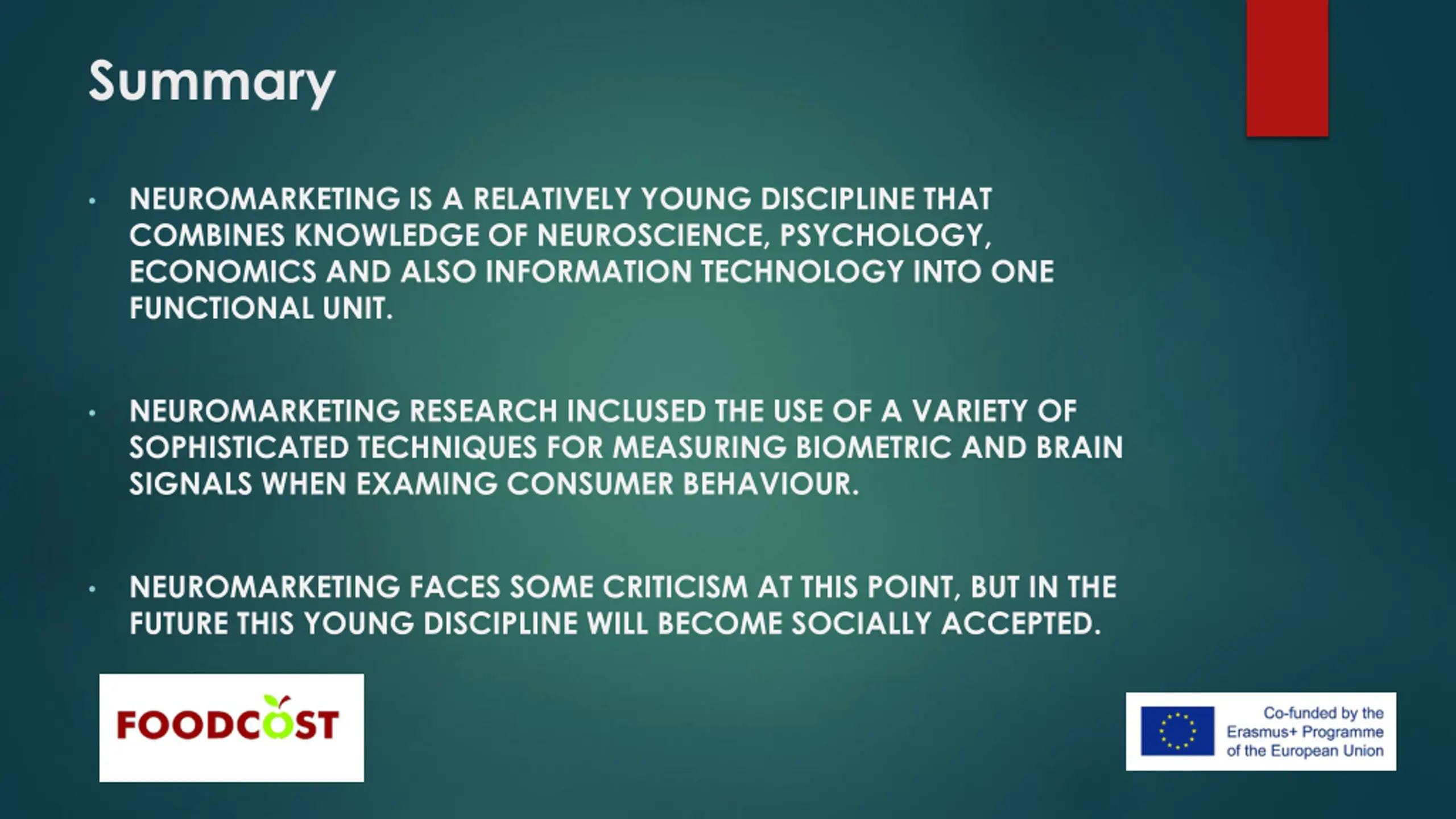 Summary NEUROMARKETING IS A RELATIVELY YOUNG DISCIPLINE THAT COMBINES KNOWLEDGE OF NEUROSCIENCE, PSYCHOLOGY, ECONOMICS AND ALSO INFORMATION TECHNOLOGY INTO ONE FUNCTIONAL UNIT. NEUROMARKETING RESEARCH INCLUSED THE USE OF A VARIETY OF SOPHISTICATED TECHNIQUES FOR MEASURING BIOMETRIC AND BRAIN SIGNALS WHEN EXAMING CONSUMER BEHAVIOUR. NEUROMARKETING FACES SOME CRITICISM AT THIS POINT, BUT IN THE FUTURE THIS YOUNG DISCIPLINE WILL BECOME SOCIALLY ACCEPTED.