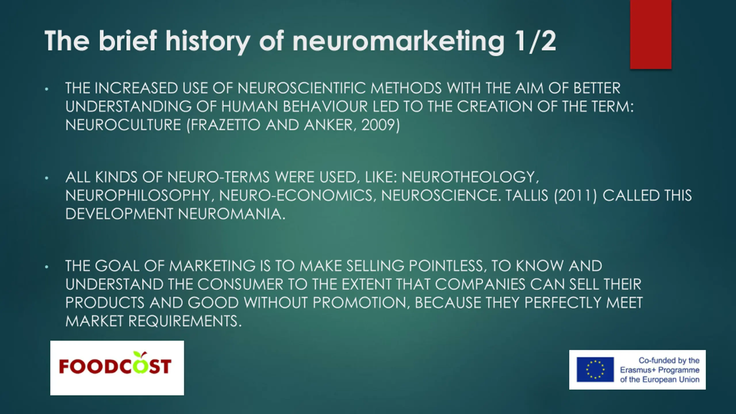 The brief history of neuromarketing 1/2 THE INCREASED USE OF NEUROSCIENTIFIC METHODS WITH THE AIM OF BETTER UNDERSTANDING OF HUMAN BEHAVIOUR LED TO THE CREATION OF THE TERM: NEUROCULTURE (FRAZETTO AND ANKER, 2009) ALL KINDS OF NEURO-TERMS WERE USED, LIKE: NEUROTHEOLOGY, NEUROPHILOSOPHY, NEURO-ECONOMICS, NEUROSCIENCE. TALLIS (2011) CALLED THIS DEVELOPMENT NEUROMANIA. THE GOAL OF MARKETING IS TO MAKE SELLING POINTLESS, TO KNOW AND UNDERSTAND THE CONSUMER TO THE EXTENT THAT COMPANIES CAN SELL THEIR PRODUCTS AND GOOD WITHOUT PROMOTION, BECAUSE THEY PERFECTLY MEET MARKET REQUIREMENTS.