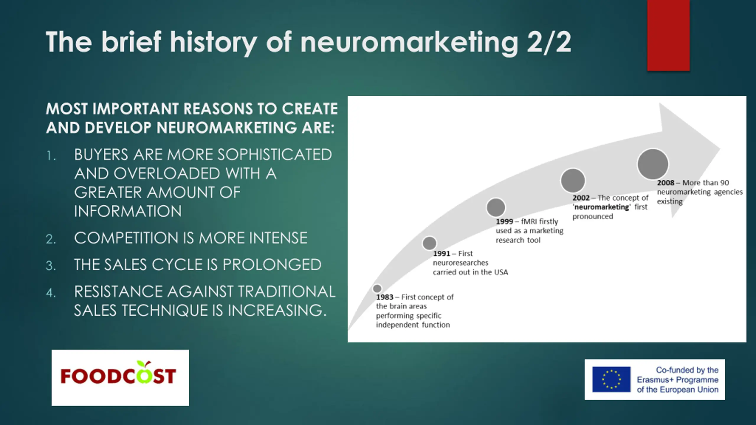 The brief history of neuromarketing 2/2 MOST IMPORTANT REASONS TO CREATE AND DEVELOP NEUROMARKETING ARE: BUYERS ARE MORE SOPHISTICATED AND OVERLOADED WITH A GREATER AMOUNT OF INFORMATION COMPETITION IS MORE INTENSE THE SALES CYCLE IS PROLONGED RESISTANCE AGAINST TRADITIONAL SALES TECHNIQUE IS INCREASING. 1. 2. 3. 4.
