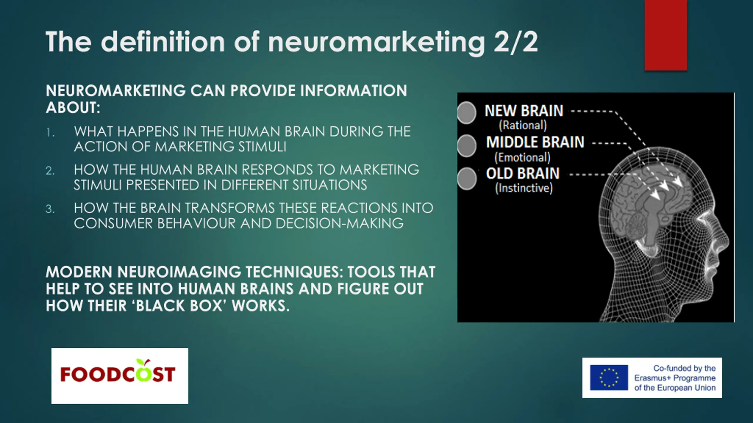 The definition of neuromarketing 2/2 NEUROMARKETING CAN PROVIDE INFORMATION ABOUT: WHAT HAPPENS IN THE HUMAN BRAIN DURING THE ACTION OF MARKETING STIMULI HOW THE HUMAN BRAIN RESPONDS TO MARKETING STIMULI PRESENTED IN DIFFERENT SITUATIONS HOW THE BRAIN TRANSFORMS THESE REACTIONS INTO CONSUMER BEHAVIOUR AND DECISION-MAKING 1. 2. 3. MODERN NEUROIMAGING TECHNIQUES: TOOLS THAT HELP TO SEE INTO HUMAN BRAINS AND FIGURE OUT HOW THEIR BLACK BOX WORKS.