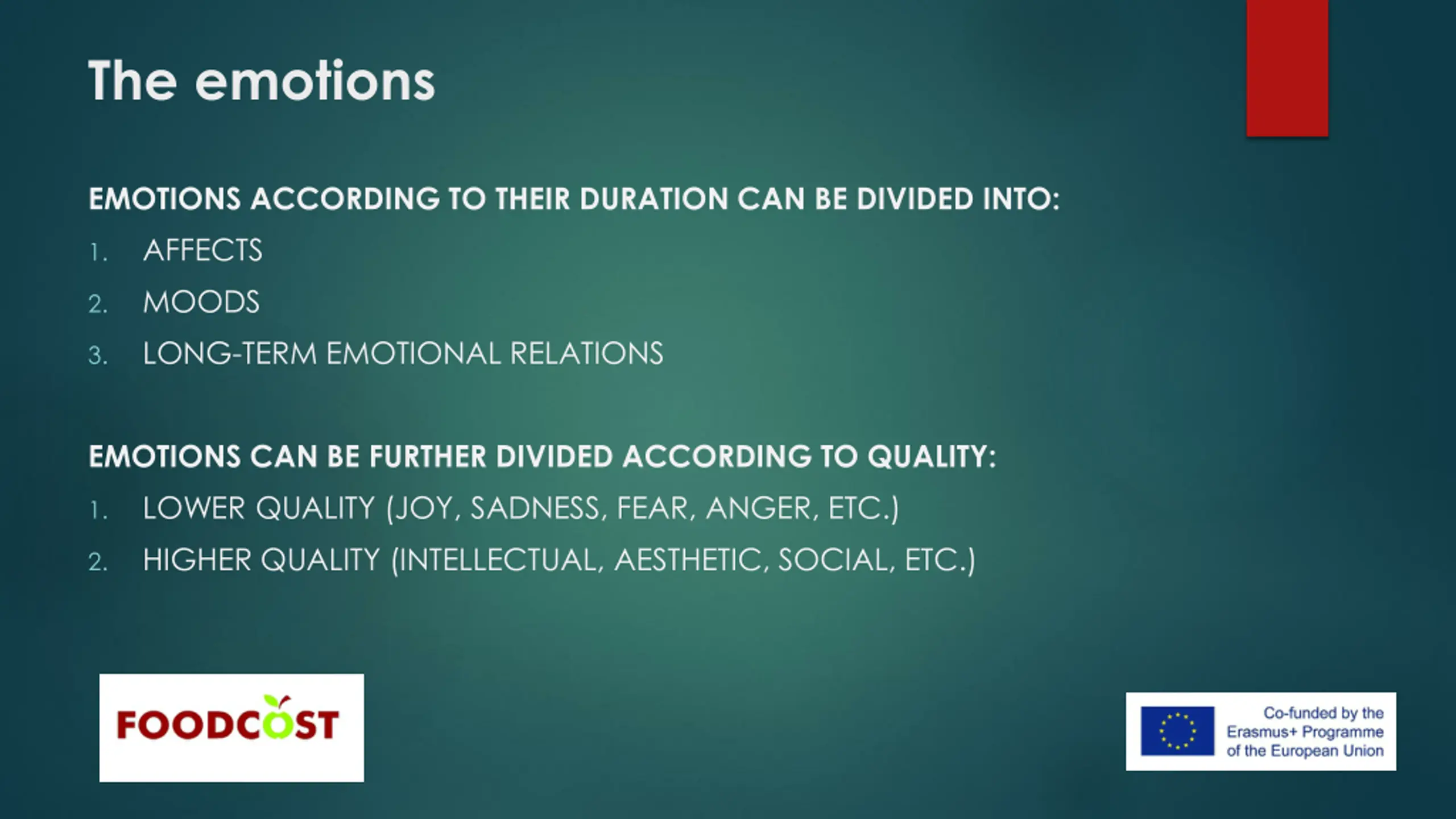 The emotions EMOTIONS ACCORDING TO THEIR DURATION CAN BE DIVIDED INTO: AFFECTS MOODS LONG-TERM EMOTIONAL RELATIONS 1. 2. 3. EMOTIONS CAN BE FURTHER DIVIDED ACCORDING TO QUALITY: LOWER QUALITY (JOY, SADNESS, FEAR, ANGER, ETC.) HIGHER QUALITY (INTELLECTUAL, AESTHETIC, SOCIAL, ETC.) 1. 2.