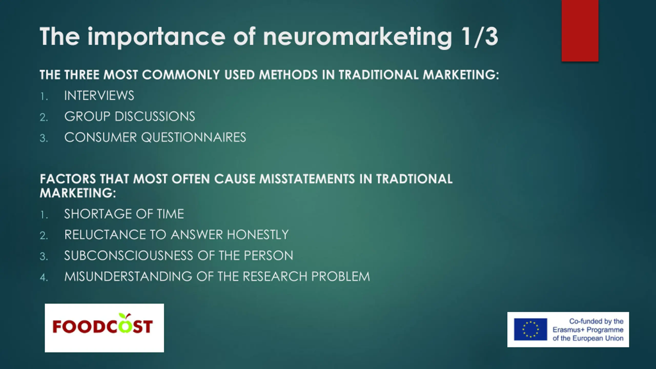 The importance of neuromarketing 1/3 THE THREE MOST COMMONLY USED METHODS IN TRADITIONAL MARKETING: INTERVIEWS GROUP DISCUSSIONS CONSUMER QUESTIONNAIRES 1. 2. 3. FACTORS THAT MOST OFTEN CAUSE MISSTATEMENTS IN TRADTIONAL MARKETING: SHORTAGE OF TIME RELUCTANCE TO ANSWER HONESTLY SUBCONSCIOUSNESS OF THE PERSON MISUNDERSTANDING OF THE RESEARCH PROBLEM 1. 2. 3. 4.