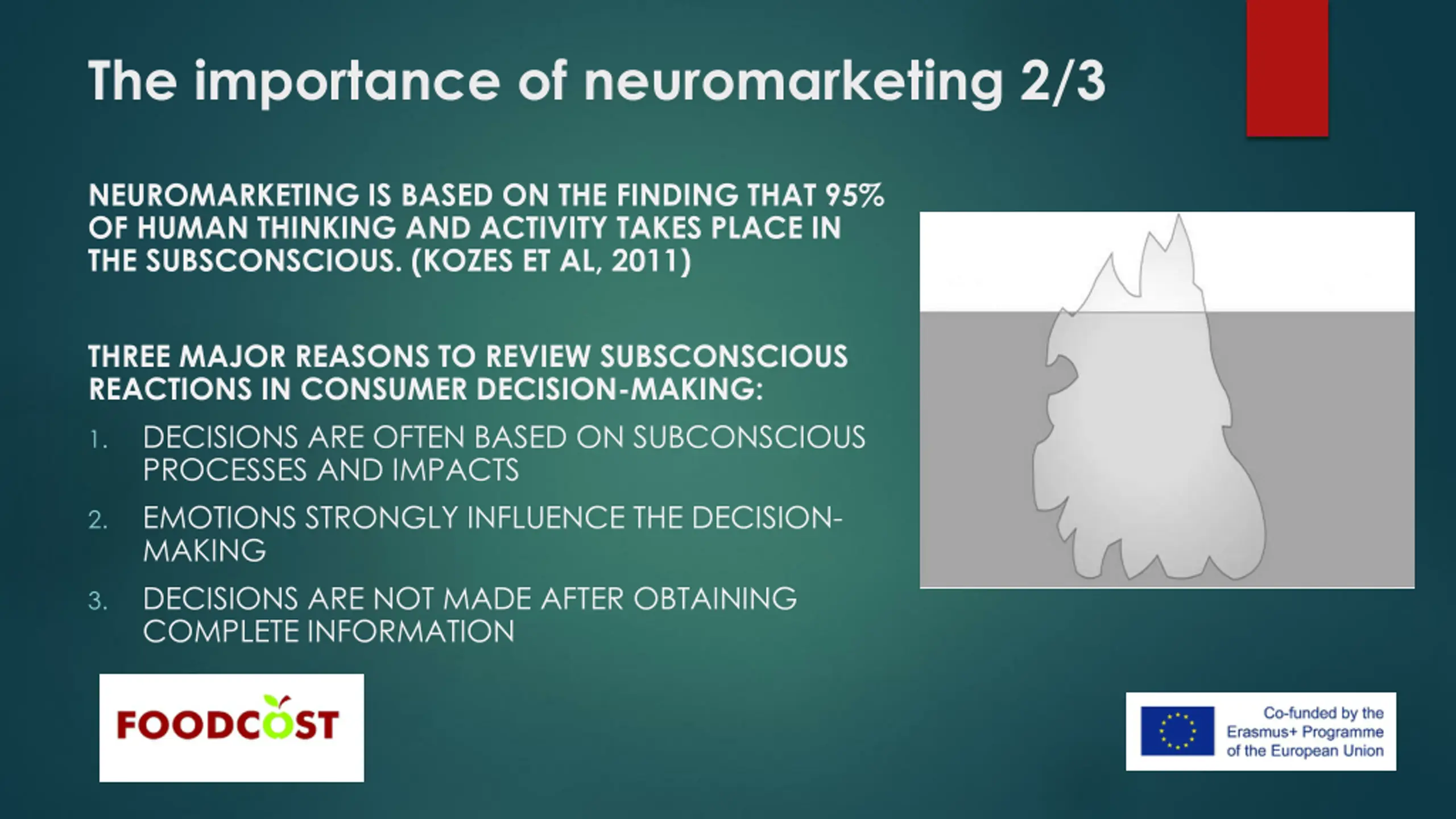 The importance of neuromarketing 2/3 NEUROMARKETING IS BASED ON THE FINDING THAT 95% OF HUMAN THINKING AND ACTIVITY TAKES PLACE IN THE SUBSCONSCIOUS. (KOZES ET AL, 2011) THREE MAJOR REASONS TO REVIEW SUBSCONSCIOUS REACTIONS IN CONSUMER DECISION-MAKING: DECISIONS ARE OFTEN BASED ON SUBCONSCIOUS PROCESSES AND IMPACTS EMOTIONS STRONGLY INFLUENCE THE DECISION- MAKING DECISIONS ARE NOT MADE AFTER OBTAINING COMPLETE INFORMATION 1. 2. 3.