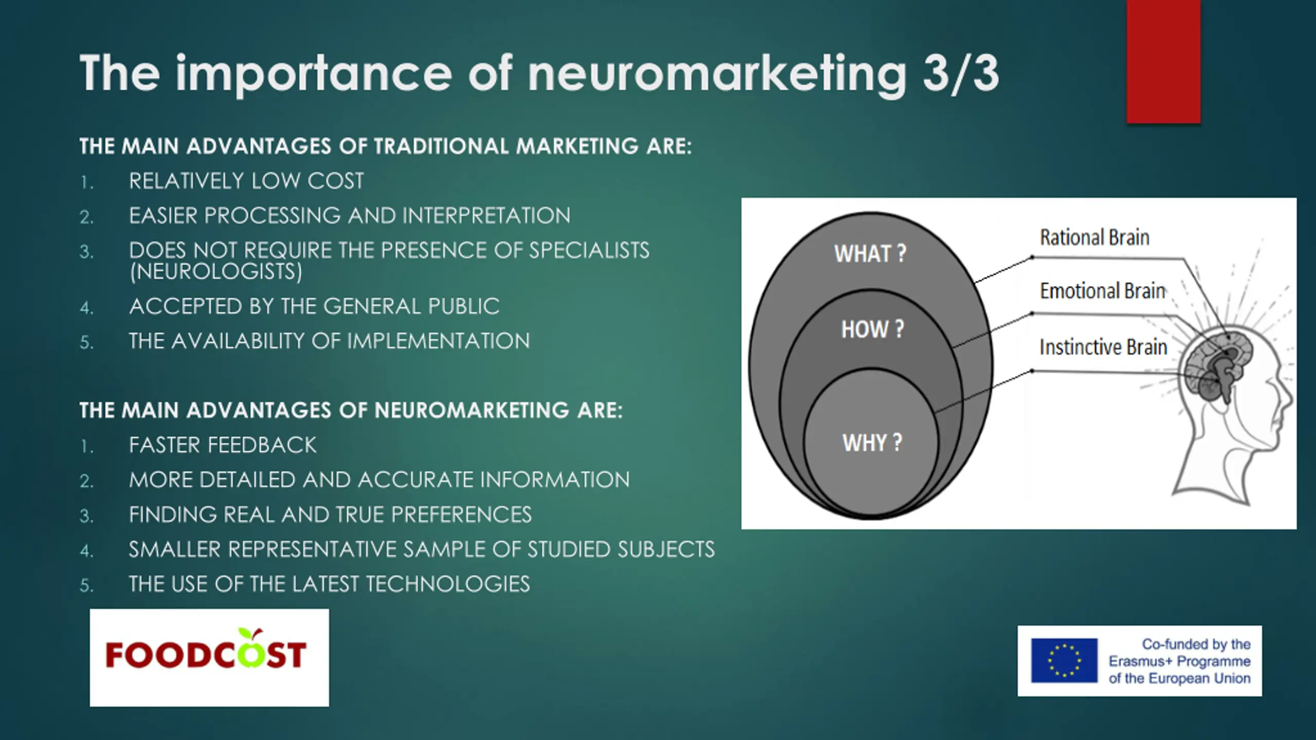 The importance of neuromarketing 3/3 THE MAIN ADVANTAGES OF TRADITIONAL MARKETING ARE: RELATIVELY LOW COST EASIER PROCESSING AND INTERPRETATION DOES NOT REQUIRE THE PRESENCE OF SPECIALISTS (NEUROLOGISTS) ACCEPTED BY THE GENERAL PUBLIC THE AVAILABILITY OF IMPLEMENTATION 1. 2. 3. 4. 5. THE MAIN ADVANTAGES OF NEUROMARKETING ARE: FASTER FEEDBACK MORE DETAILED AND ACCURATE INFORMATION FINDING REAL AND TRUE PREFERENCES SMALLER REPRESENTATIVE SAMPLE OF STUDIED SUBJECTS THE USE OF THE LATEST TECHNOLOGIES 1. 2. 3. 4. 5.