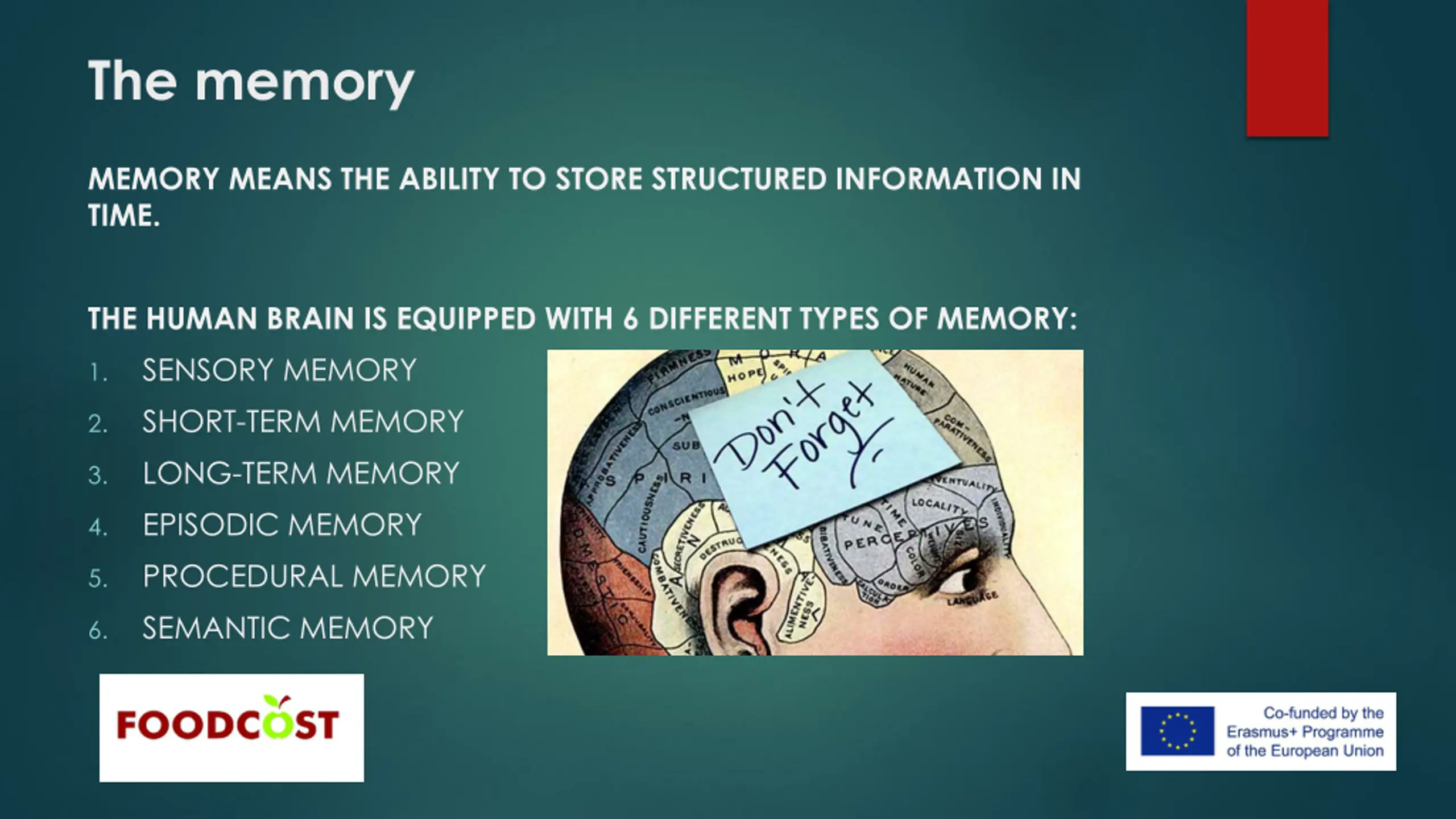 The memory MEMORY MEANS THE ABILITY TO STORE STRUCTURED INFORMATION IN TIME. THE HUMAN BRAIN IS EQUIPPED WITH 6 DIFFERENT TYPES OF MEMORY: SENSORY MEMORY SHORT-TERM MEMORY LONG-TERM MEMORY EPISODIC MEMORY PROCEDURAL MEMORY SEMANTIC MEMORY 1. 2. 3. 4. 5. 6.
