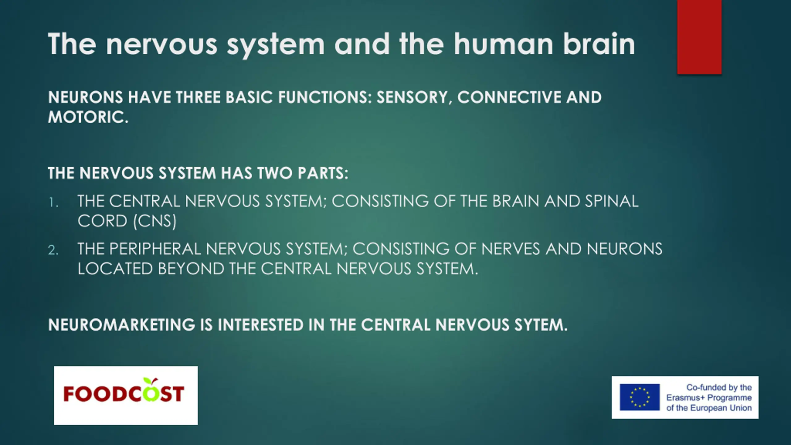 The nervous system and the human brain NEURONS HAVE THREE BASIC FUNCTIONS: SENSORY, CONNECTIVE AND MOTORIC. THE NERVOUS SYSTEM HAS TWO PARTS: THE CENTRAL NERVOUS SYSTEM; CONSISTING OF THE BRAIN AND SPINAL CORD (CNS) THE PERIPHERAL NERVOUS SYSTEM; CONSISTING OF NERVES AND NEURONS LOCATED BEYOND THE CENTRAL NERVOUS SYSTEM. 1. 2. NEUROMARKETING IS INTERESTED IN THE CENTRAL NERVOUS SYTEM.
