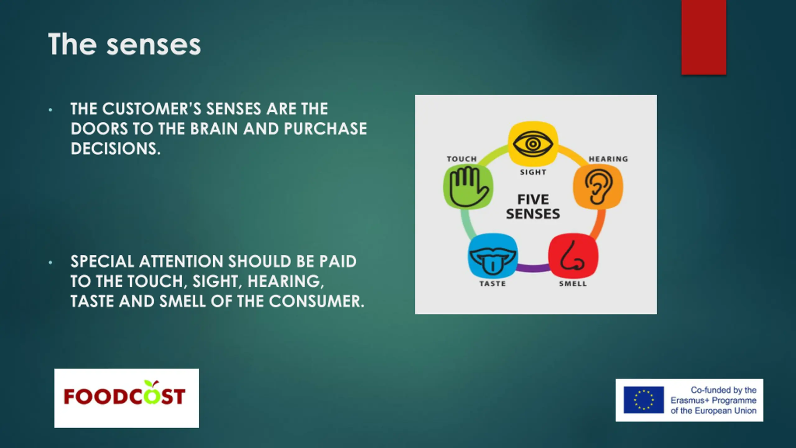 The senses THE CUSTOMER S SENSES ARE THE DOORS TO THE BRAIN AND PURCHASE DECISIONS. SPECIAL ATTENTION SHOULD BE PAID TO THE TOUCH, SIGHT, HEARING, TASTE AND SMELL OF THE CONSUMER.