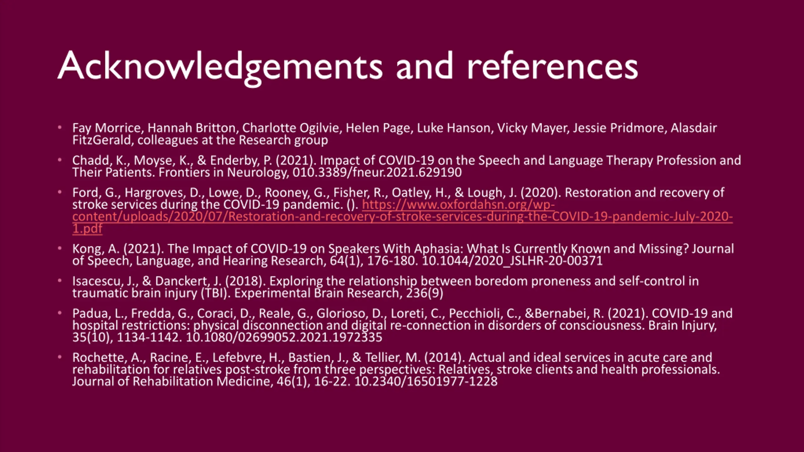 Acknowledgements and references Fay Morrice, Hannah Britton, Charlotte Ogilvie, Helen Page, Luke Hanson, Vicky Mayer, Jessie Pridmore, Alasdair FitzGerald, colleagues at the Research group Chadd, K., Moyse, K., & Enderby, P. (2021). Impact of COVID-19 on the Speech and Language Therapy Profession and Their Patients. Frontiers in Neurology, 010.3389/fneur.2021.629190 Ford, G., Hargroves, D., Lowe, D., Rooney, G., Fisher, R., Oatley, H., & Lough, J. (2020). Restoration and recovery of stroke services during the COVID-19 pandemic. (). https://www.oxfordahsn.org/wp- content/uploads/2020/07/Restoration-and-recovery-of-stroke-services-during-the-COVID-19-pandemic-July-2020- 1.pdf Kong, A. (2021). The Impact of COVID-19 on Speakers With Aphasia: What Is Currently Known and Missing? Journal of Speech, Language, and Hearing Research, 64(1), 176-180. 10.1044/2020_JSLHR-20-00371 Isacescu, J., & Danckert, J. (2018). Exploring the relationship between boredom proneness and self-control in traumatic brain injury (TBI). Experimental Brain Research, 236(9) Padua, L., Fredda, G., Coraci, D., Reale, G., Glorioso, D., Loreti, C., Pecchioli, C., &Bernabei, R. (2021). COVID-19 and hospital restrictions: physical disconnection and digital re-connection in disorders of consciousness. Brain Injury, 35(10), 1134-1142. 10.1080/02699052.2021.1972335 Rochette, A., Racine, E., Lefebvre, H., Bastien, J., & Tellier, M. (2014). Actual and ideal services in acute care and rehabilitation for relatives post-stroke from three perspectives: Relatives, stroke clients and health professionals. Journal of Rehabilitation Medicine, 46(1), 16-22. 10.2340/16501977-1228