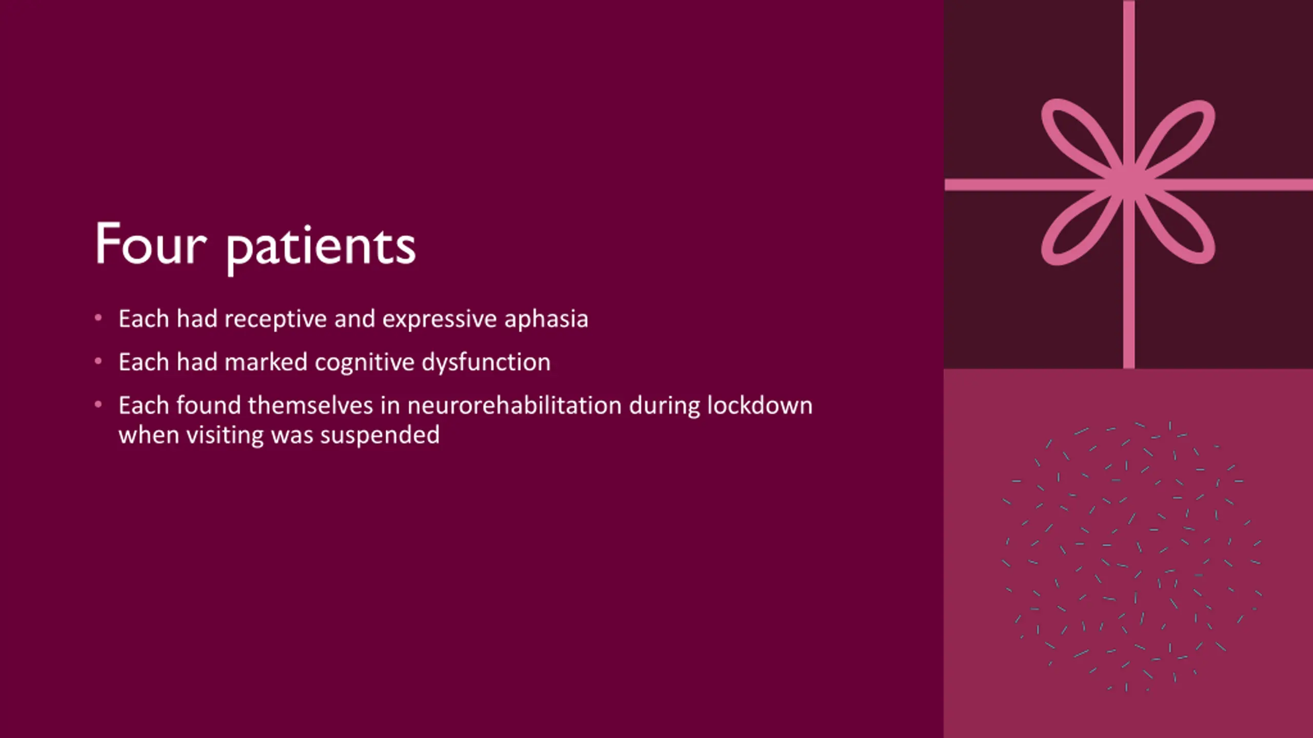 Four patients Each had receptive and expressive aphasia Each had marked cognitive dysfunction Each found themselves in neurorehabilitation during lockdown when visiting was suspended