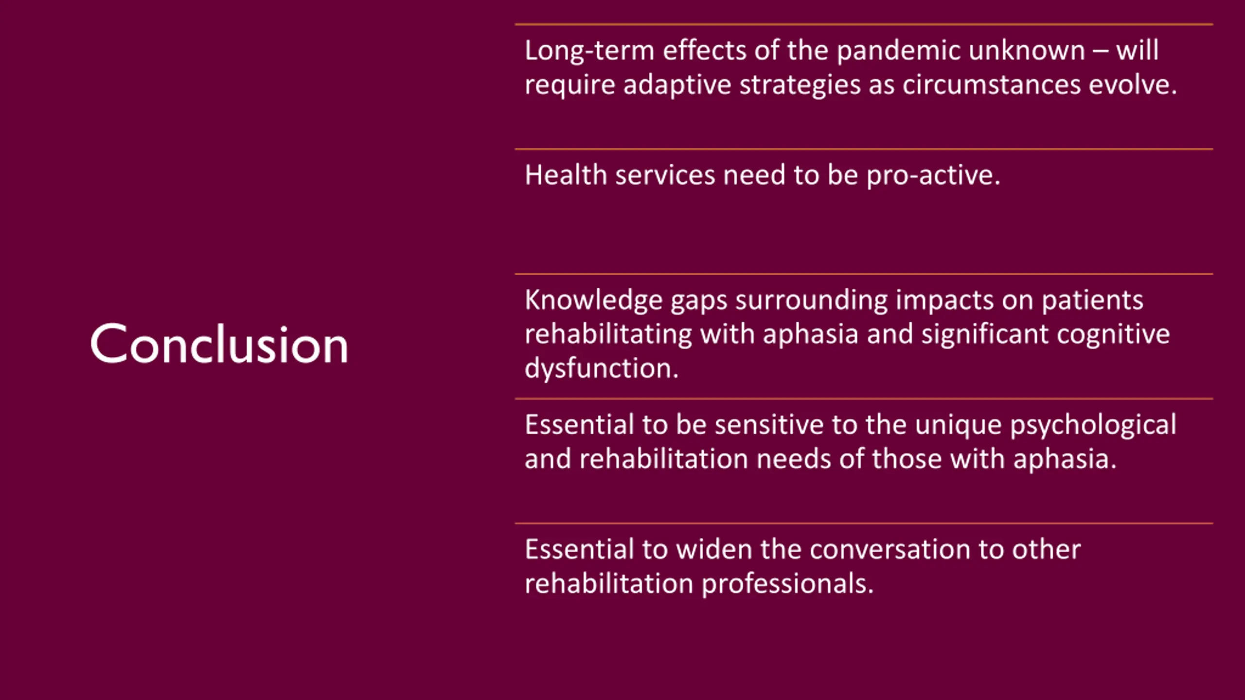 Long-term effects of the pandemic unknown will require adaptive strategies as circumstances evolve. Health services need to be pro-active. Knowledge gaps surrounding impacts on patients rehabilitating with aphasia and significant cognitive dysfunction. Conclusion Essential to be sensitive to the unique psychological and rehabilitation needs of those with aphasia. Essential to widen the conversation to other rehabilitation professionals.