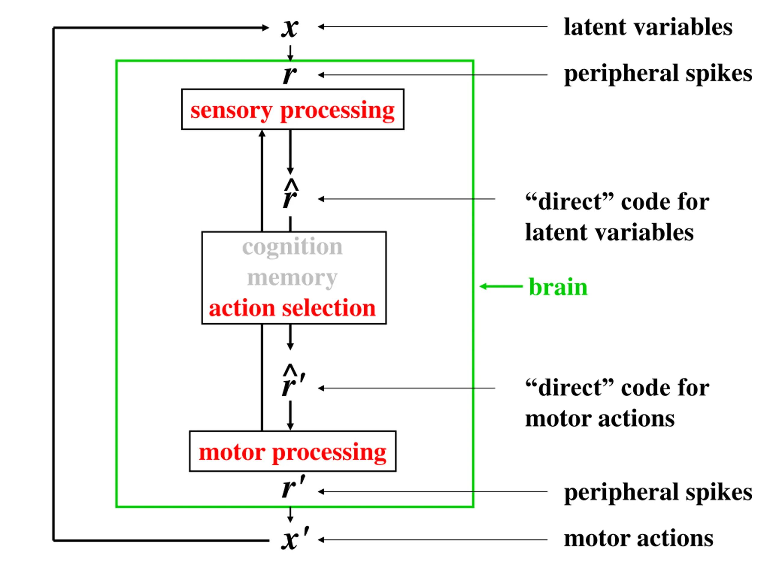 x r latent variables peripheral spikes sensory processing r^ direct code for latent variables cognition memory action selection brain r'^ direct code for motor actions motor processing r' peripheral spikes x' motor actions
