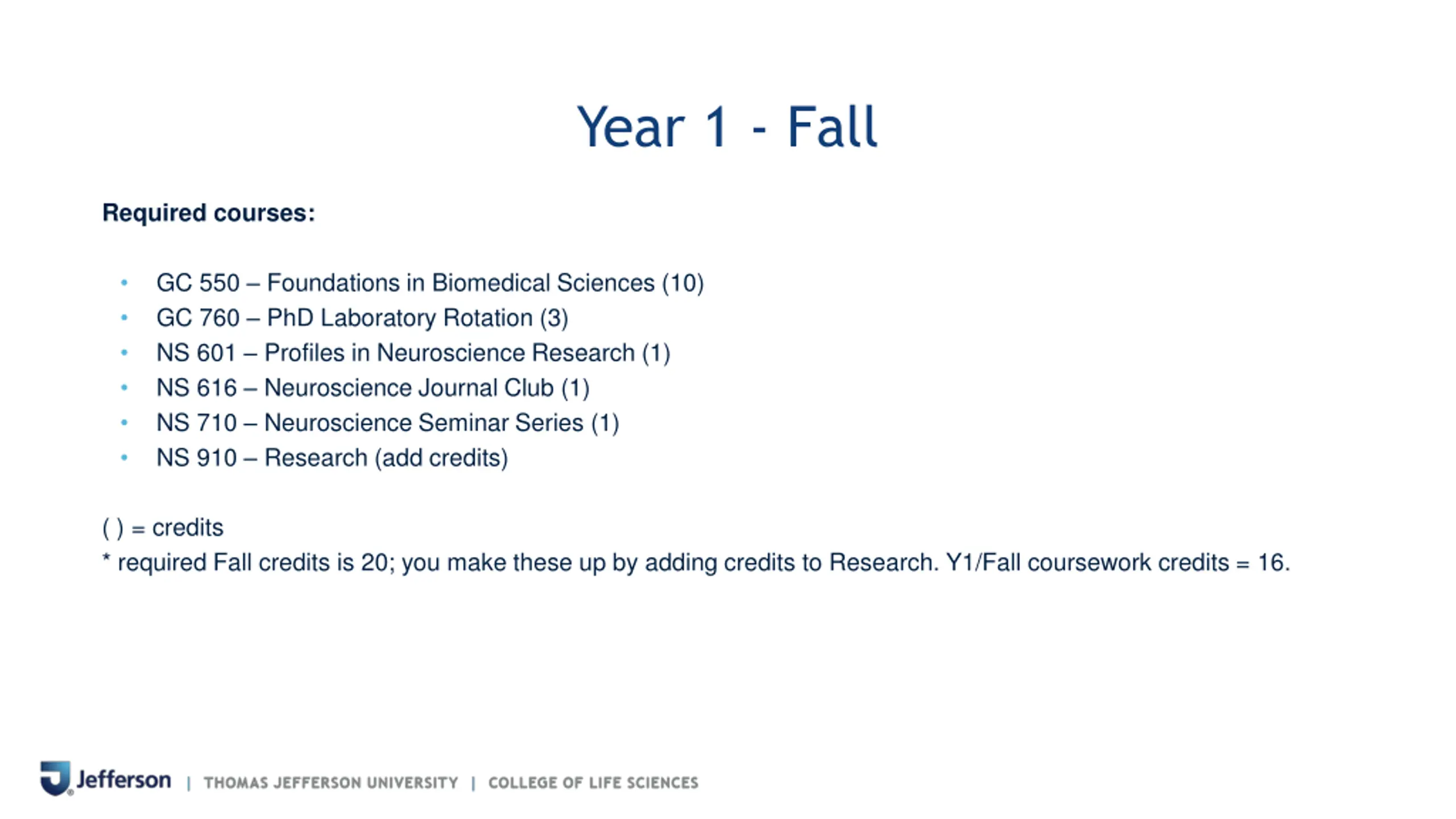 Year 1 - Fall Required courses: GC 550 Foundations in Biomedical Sciences (10) GC 760 PhD Laboratory Rotation (3) NS 601 Profiles in Neuroscience Research (1) NS 616 Neuroscience Journal Club (1) NS 710 Neuroscience Seminar Series (1) NS 910 Research (add credits) ( ) = credits * required Fall credits is 20; you make these up by adding credits to Research. Y1/Fall coursework credits = 16.