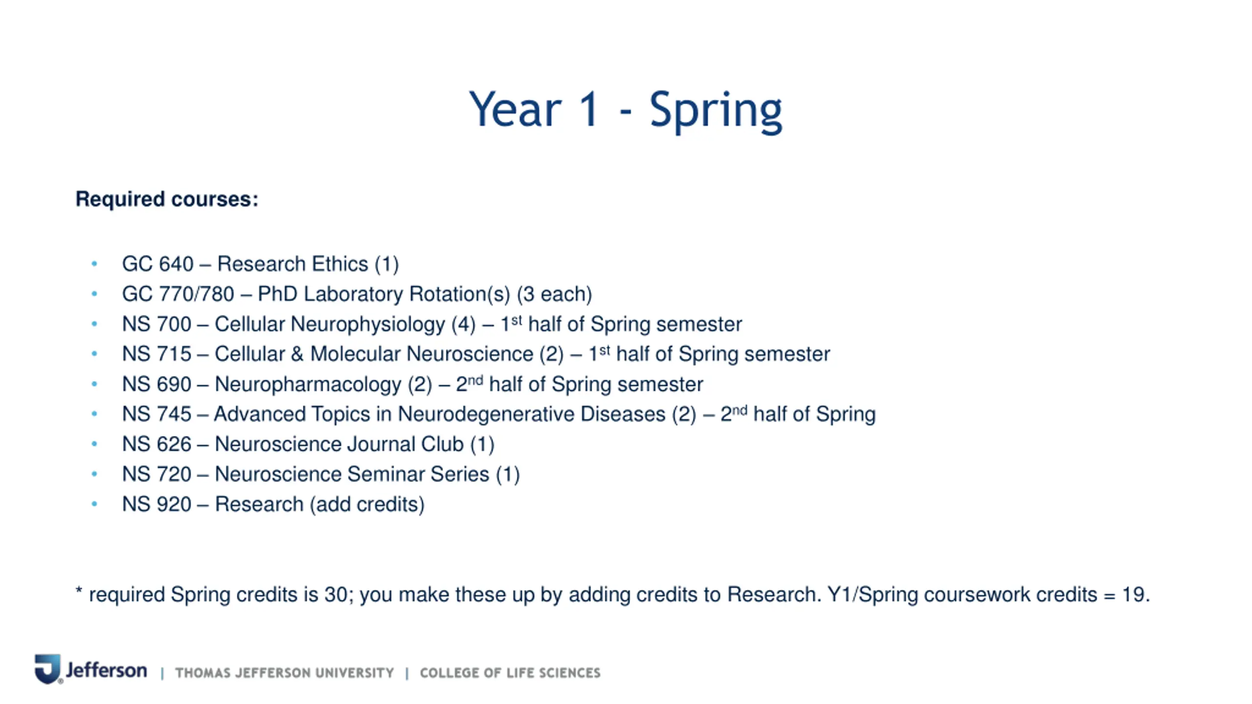 Year 1 - Spring Required courses: GC 640 Research Ethics (1) GC 770/780 PhD Laboratory Rotation(s) (3 each) NS 700 Cellular Neurophysiology (4) 1sthalf of Spring semester NS 715 Cellular & Molecular Neuroscience (2) 1sthalf of Spring semester NS 690 Neuropharmacology (2) 2ndhalf of Spring semester NS 745 Advanced Topics in Neurodegenerative Diseases (2) 2ndhalf of Spring NS 626 Neuroscience Journal Club (1) NS 720 Neuroscience Seminar Series (1) NS 920 Research (add credits) * required Spring credits is 30; you make these up by adding credits to Research. Y1/Spring coursework credits = 19.