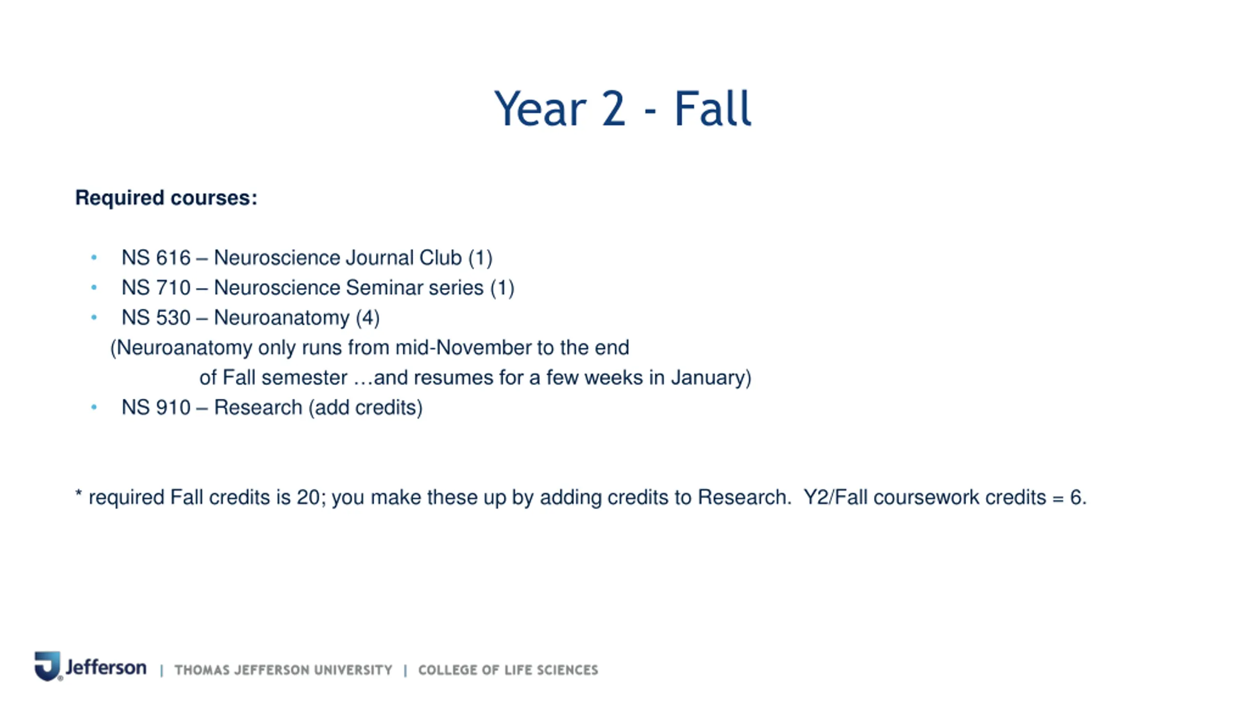 Year 2 - Fall Required courses: NS 616 Neuroscience Journal Club (1) NS 710 Neuroscience Seminar series (1) NS 530 Neuroanatomy (4) (Neuroanatomy only runs from mid-November to the end of Fall semester and resumes for a few weeks in January) NS 910 Research (add credits) * required Fall credits is 20; you make these up by adding credits to Research. Y2/Fall coursework credits = 6.