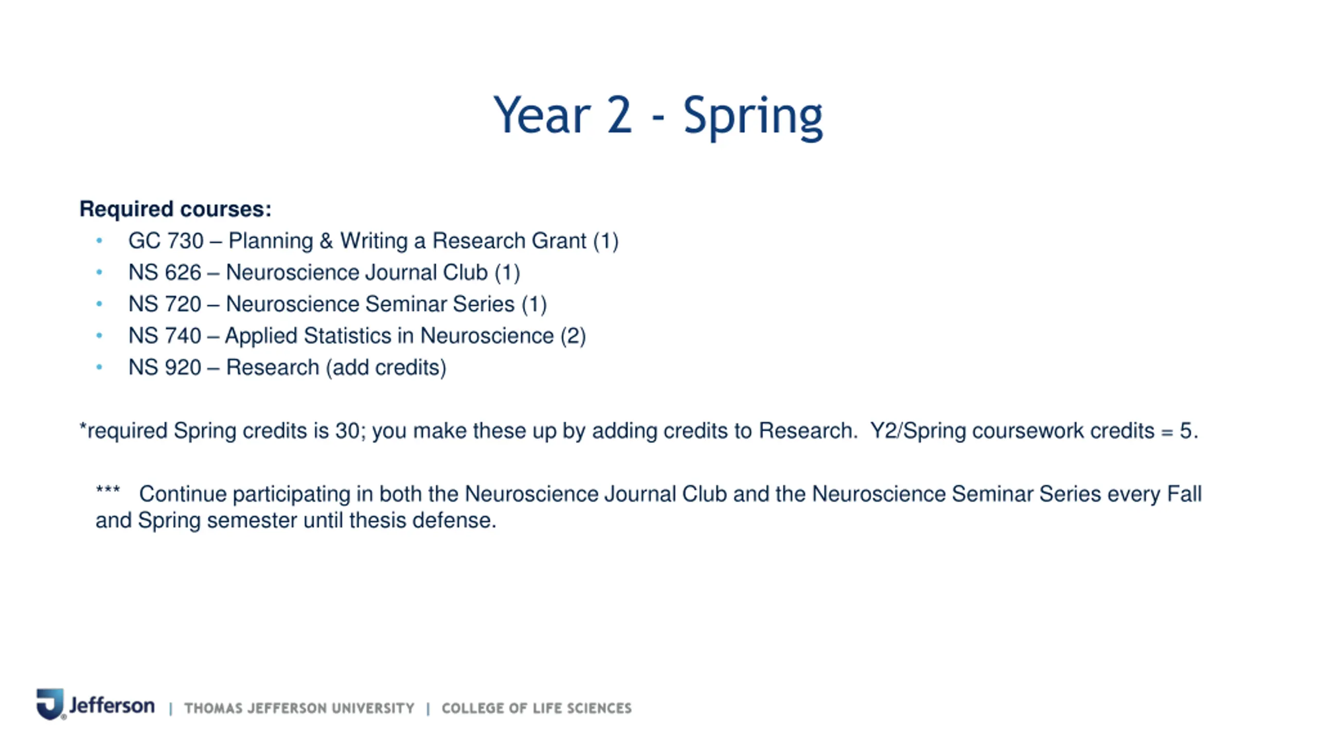 Year 2 - Spring Required courses: GC 730 Planning & Writing a Research Grant (1) NS 626 Neuroscience Journal Club (1) NS 720 Neuroscience Seminar Series (1) NS 740 Applied Statistics in Neuroscience (2) NS 920 Research (add credits) *required Spring credits is 30; you make these up by adding credits to Research. Y2/Spring coursework credits = 5. *** Continue participating in both the Neuroscience Journal Club and the Neuroscience Seminar Series every Fall and Spring semester until thesis defense.