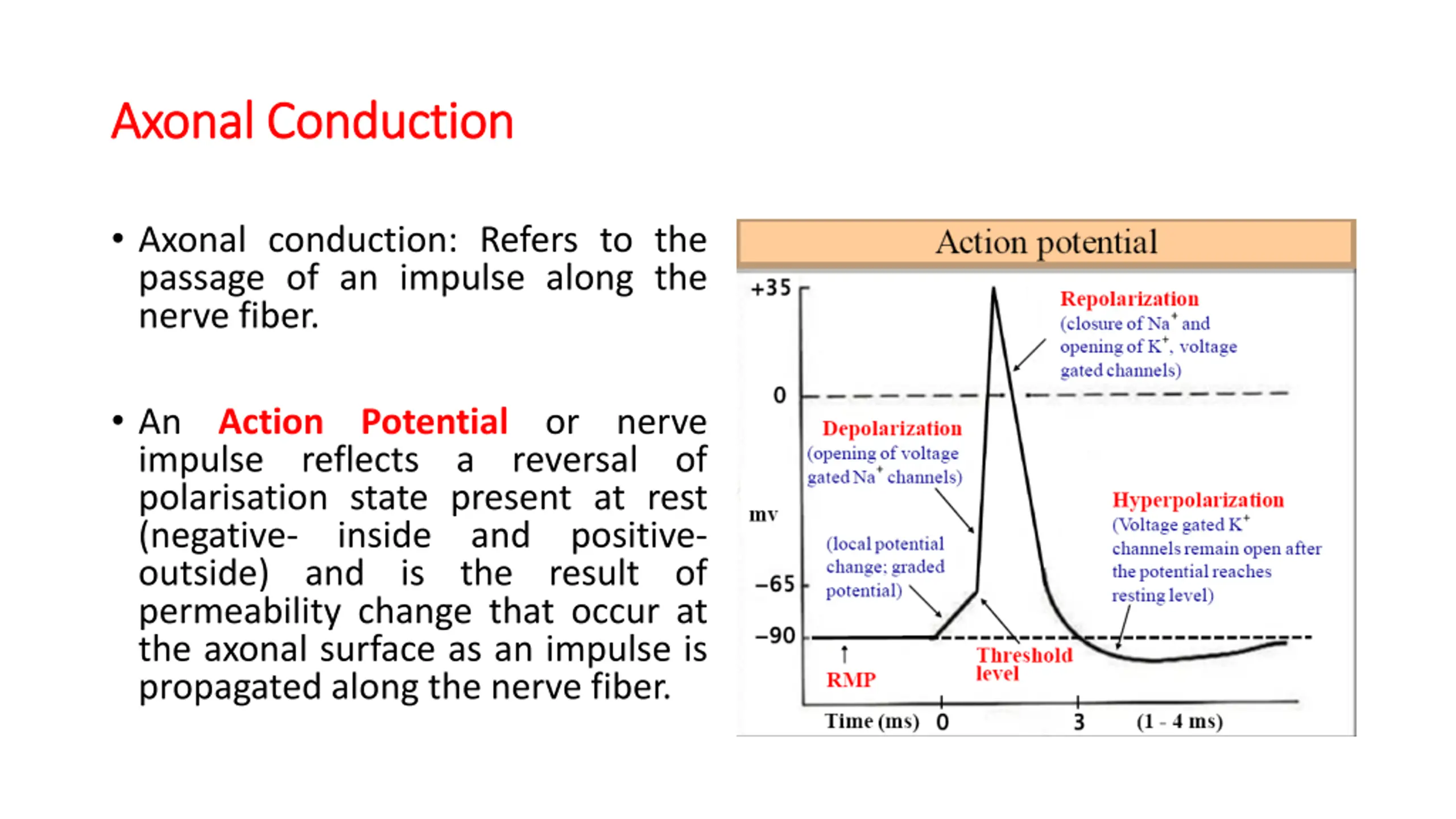 Axonal Conduction Axonal Conduction Axonal conduction: Refers to the passage of an impulse along the nerve fiber. An Action Potential or nerve impulse reflects a reversal of polarisation state present at rest (negative- inside and positive- outside) and is the result of permeability change that occur at the axonal surface as an impulse is propagated along the nerve fiber.
