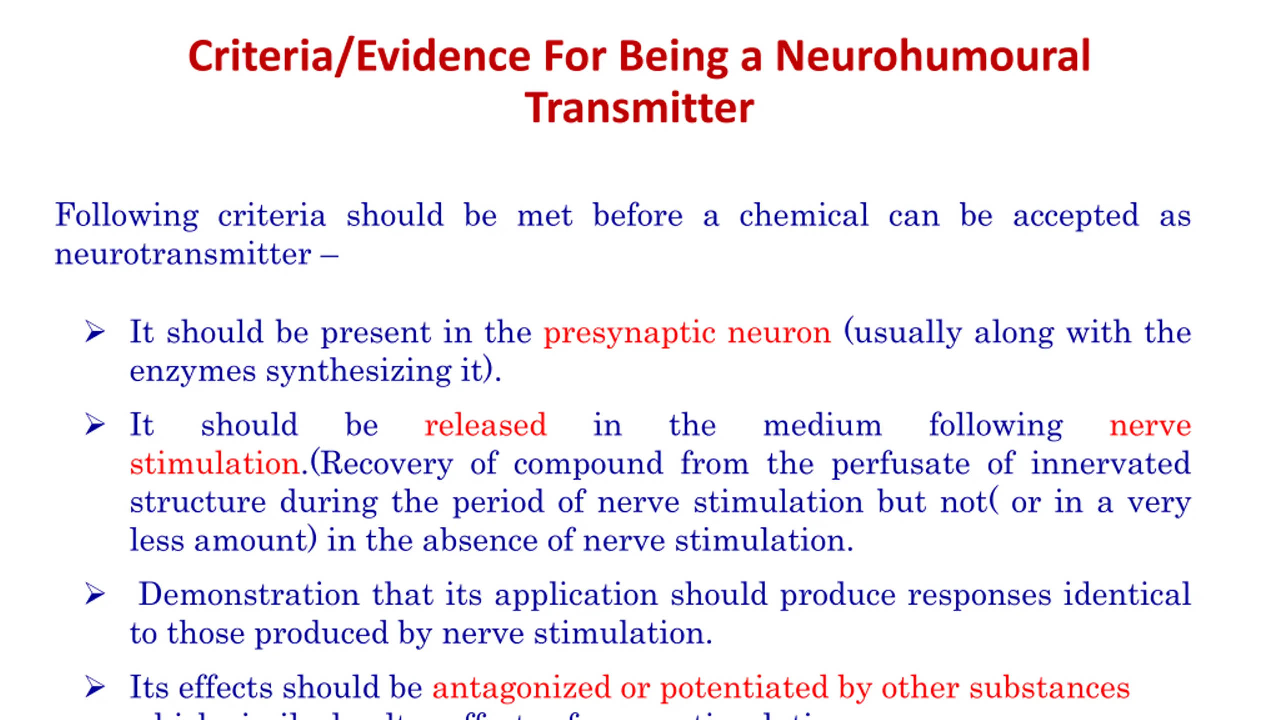 Criteria/Evidence For Being a Neurohumoural Transmitter Following criteria should be met before a chemical can be accepted as neurotransmitter It should be present in the presynaptic neuron (usually along with the enzymes synthesizing it). It should be released in stimulation.(Recovery of compound from the perfusate of innervated structure during the period of nerve stimulation but not( or in a very less amount) in the absence of nerve stimulation. Demonstration that its application should produce responses identical to those produced by nerve stimulation. Its effects should be antagonized or potentiated by other substances which similarly alter effects of nerve stimulation. the medium following nerve