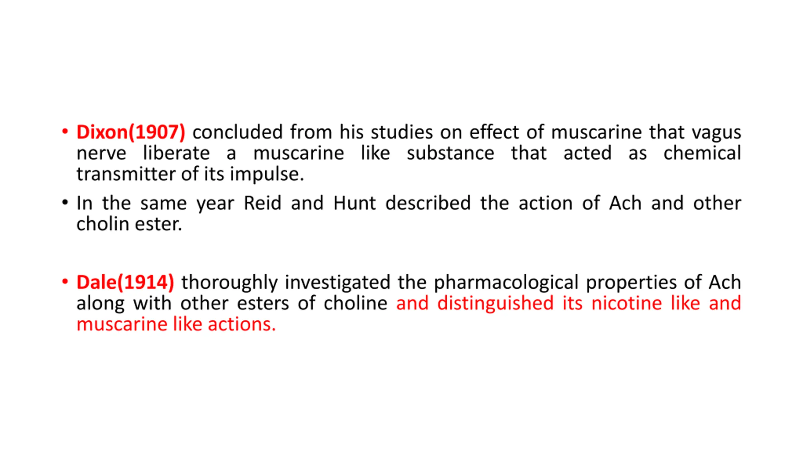 Dixon(1907) concluded from his studies on effect of muscarine that vagus nerve liberate a muscarine like substance that acted as chemical transmitter of its impulse. In the same year Reid and Hunt described the action of Ach and other cholin ester. Dale(1914) thoroughly investigated the pharmacological properties of Ach along with other esters of choline and distinguished its nicotine like and muscarine like actions. In 1921, cannon and Uridil (1921) reported that stimulation of sympathetic hepatic nerve