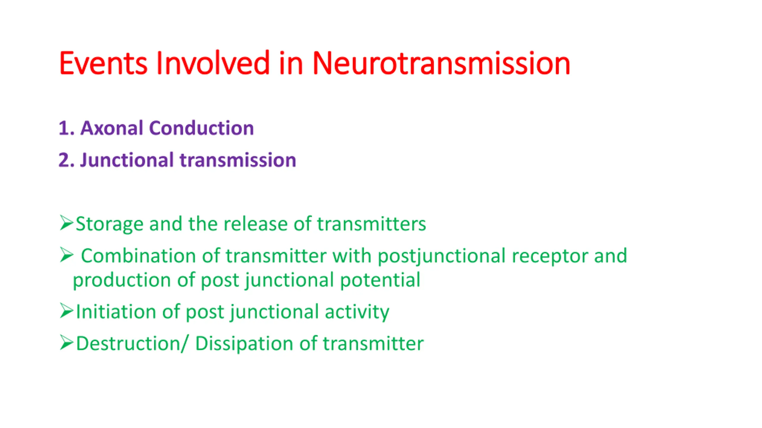 Events Involved Events Involved in Neurotransmission in Neurotransmission 1. Axonal Conduction 2. Junctional transmission Storage and the release of transmitters Combination of transmitter with postjunctional receptor and production of post junctional potential Initiation of post junctional activity Destruction/ Dissipation of transmitter