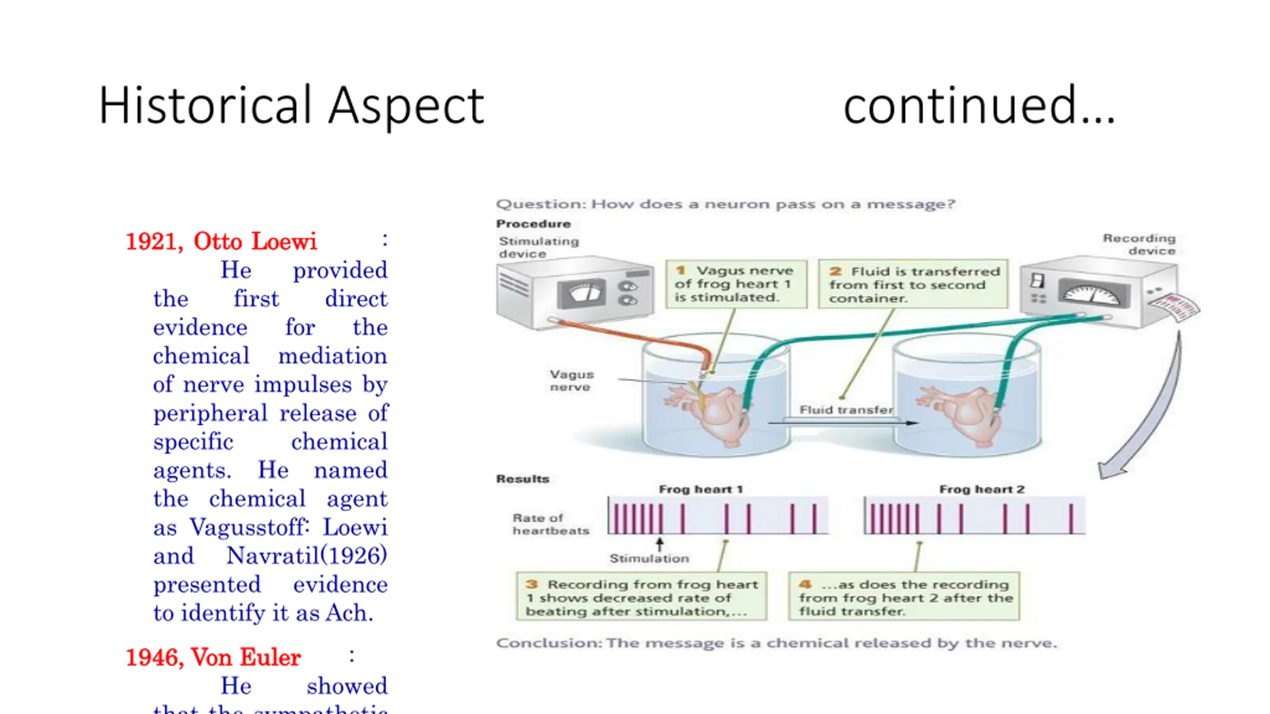 Historical Aspect continued 1921 1921, , Otto Otto Loewi Loewi He the first evidence chemical mediation of nerve impulses by peripheral release of specific agents. He named the chemical agent as Vagusstoff: Loewi and Navratil(1926) presented to identify it as Ach. : provided direct for the chemical evidence 1946 1946, , Von Von Euler Euler He that the sympathetic : showed