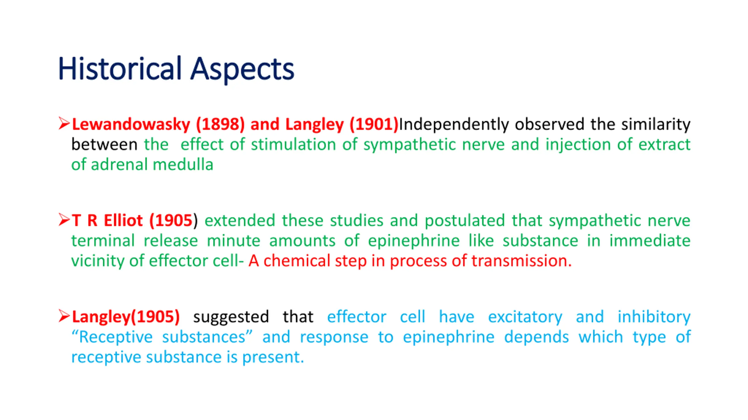Historical Aspects Historical Aspects Lewandowasky (1898) and Langley (1901)Independently observed the similarity between the effect of stimulation of sympathetic nerve and injection of extract of adrenal medulla T R Elliot (1905) extended these studies and postulated that sympathetic nerve terminal release minute amounts of epinephrine like substance in immediate vicinity of effector cell- A chemical step in process of transmission. Langley(1905) suggested that effector cell have excitatory and inhibitory Receptive substances and response to epinephrine depends which type of receptive substance is present.