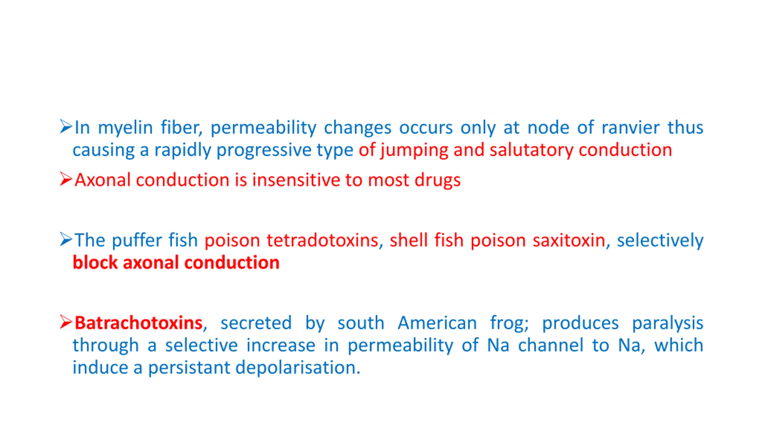 In myelin fiber, permeability changes occurs only at node of ranvier thus causing a rapidly progressive type of jumping and salutatory conduction Axonal conduction is insensitive to most drugs The puffer fish poison tetradotoxins, shell fish poison saxitoxin, selectively block axonal conduction Batrachotoxins, secreted by south American frog; produces paralysis through a selective increase in permeability of Na channel to Na, which induce a persistant depolarisation.
