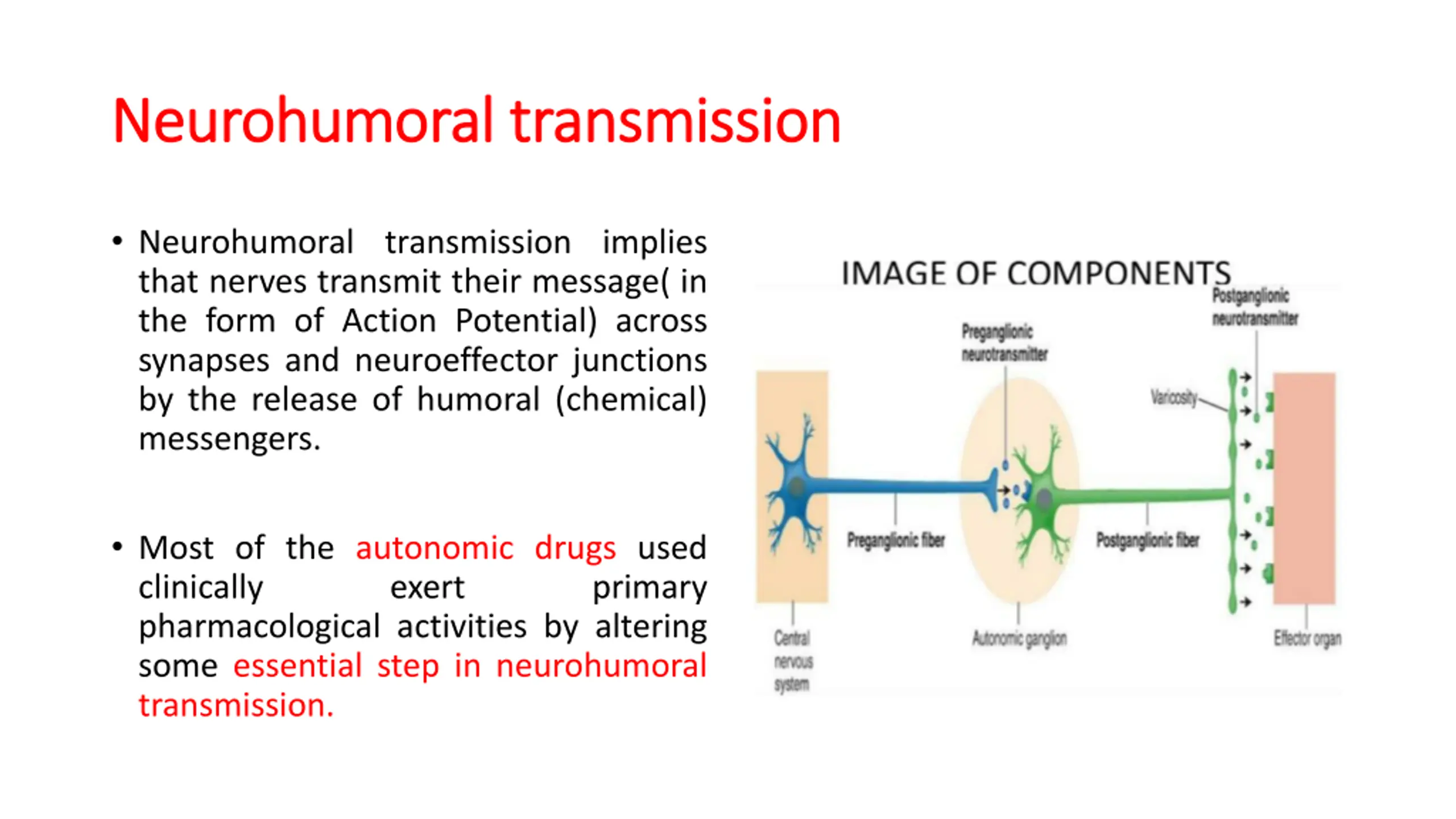 Neurohumoral Neurohumoral transmission transmission Neurohumoral transmission implies that nerves transmit their message( in the form of Action Potential) across synapses and neuroeffector junctions by the release of humoral (chemical) messengers. Most of the autonomic drugs used clinically exert pharmacological activities by altering some essential step in neurohumoral transmission. primary