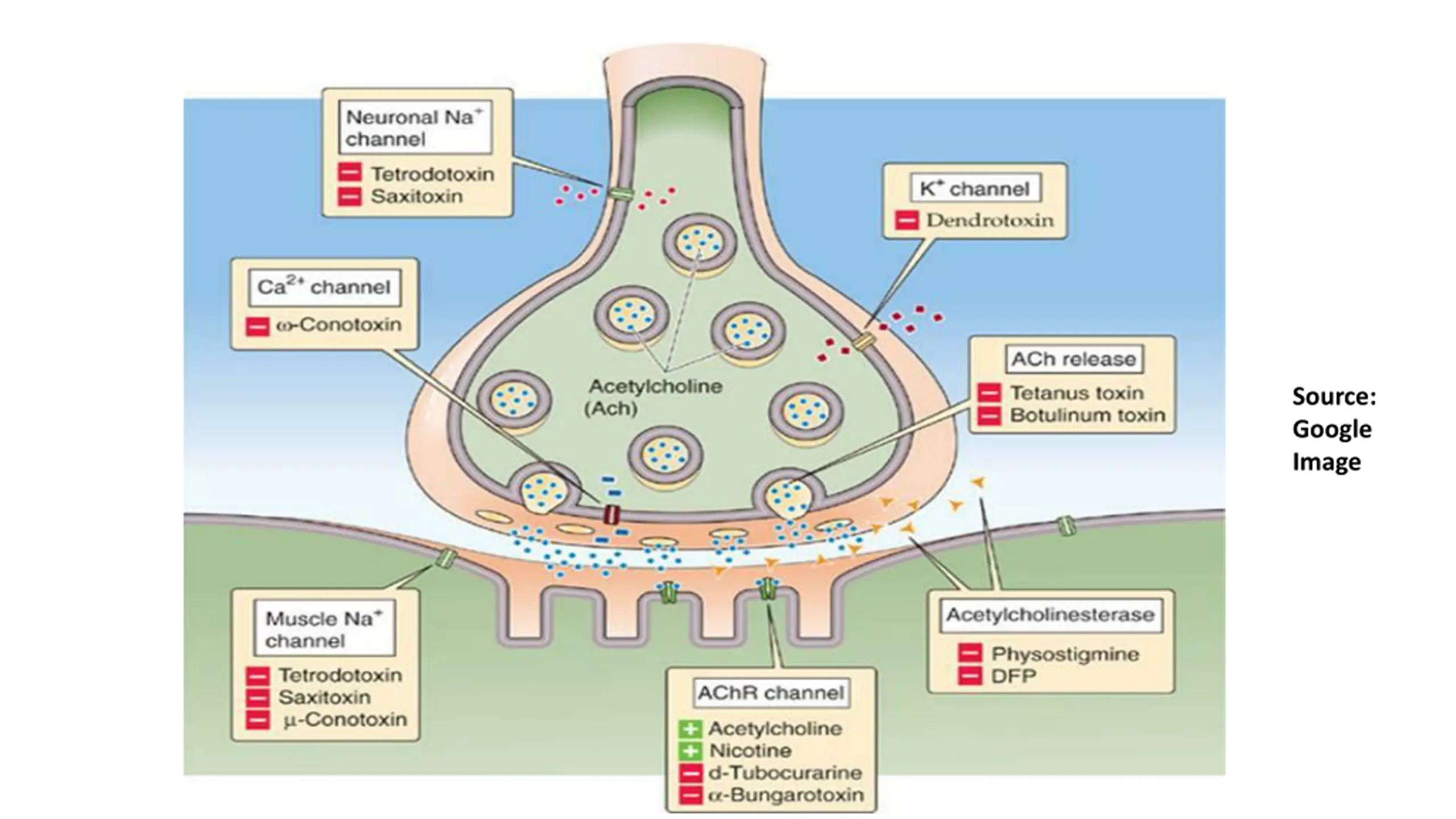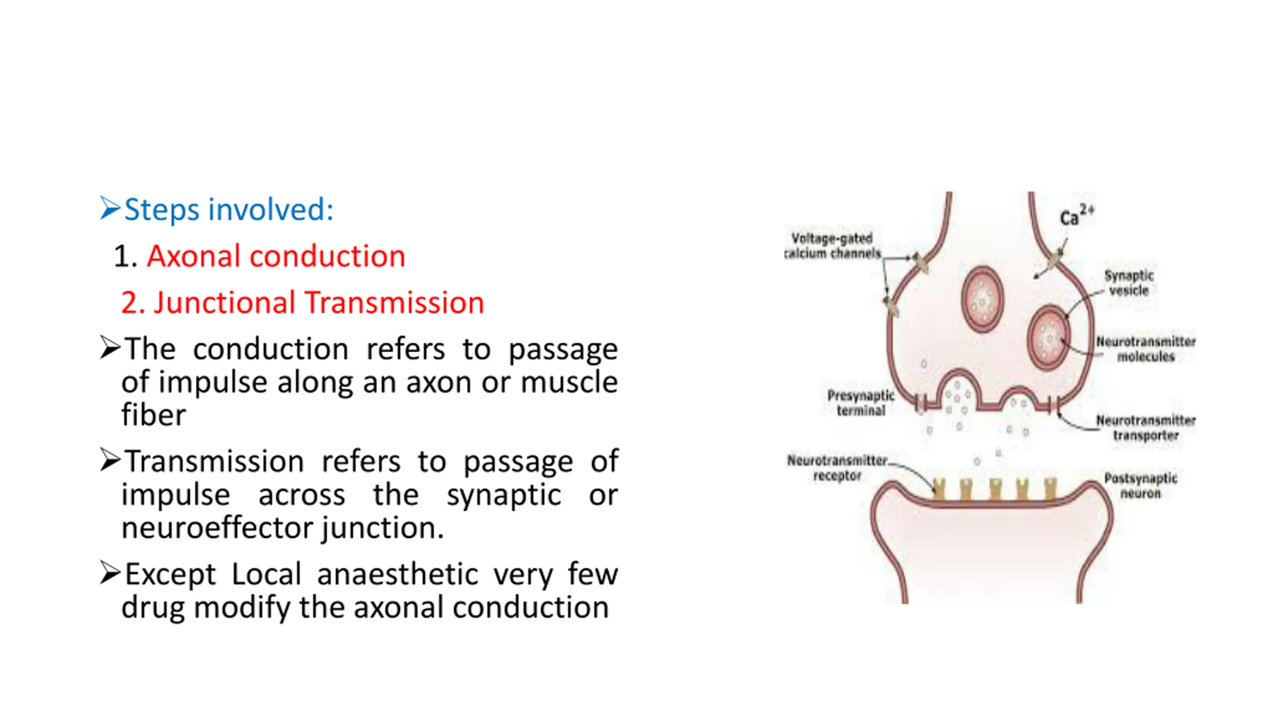 Steps involved: 1. Axonal conduction 2. Junctional Transmission The conduction refers to passage of impulse along an axon or muscle fiber Transmission refers to passage of impulse across the synaptic or neuroeffector junction. Except Local anaesthetic very few drug modify the axonal conduction