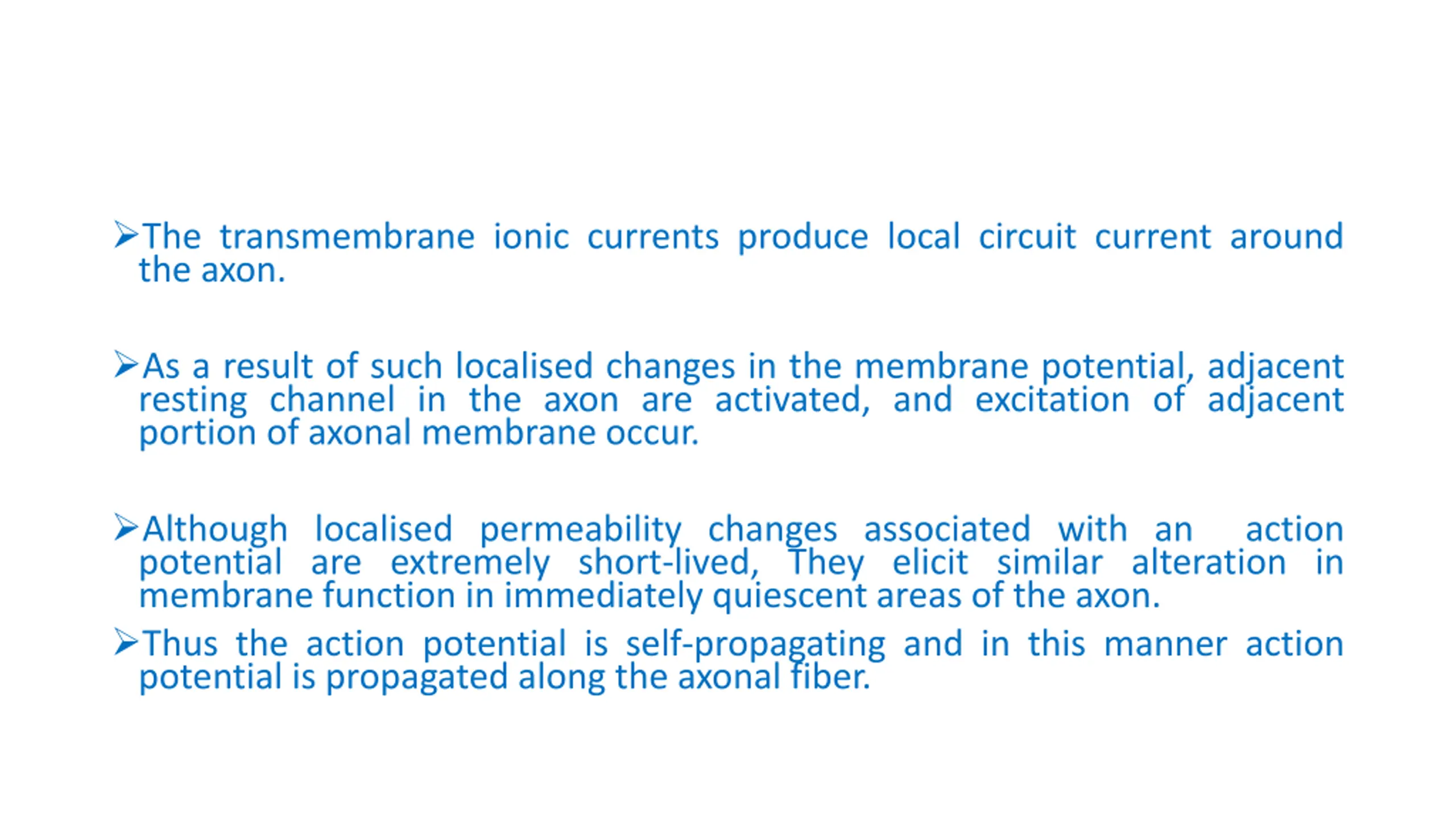 The transmembrane ionic currents produce local circuit current around the axon. As a result of such localised changes in the membrane potential, adjacent resting channel in the axon are activated, and excitation of adjacent portion of axonal membrane occur. Although localised permeability changes associated with an action potential are extremely short-lived, They elicit similar alteration in membrane function in immediately quiescent areas of the axon. Thus the action potential is self-propagating and in this manner action potential is propagated along the axonal fiber.