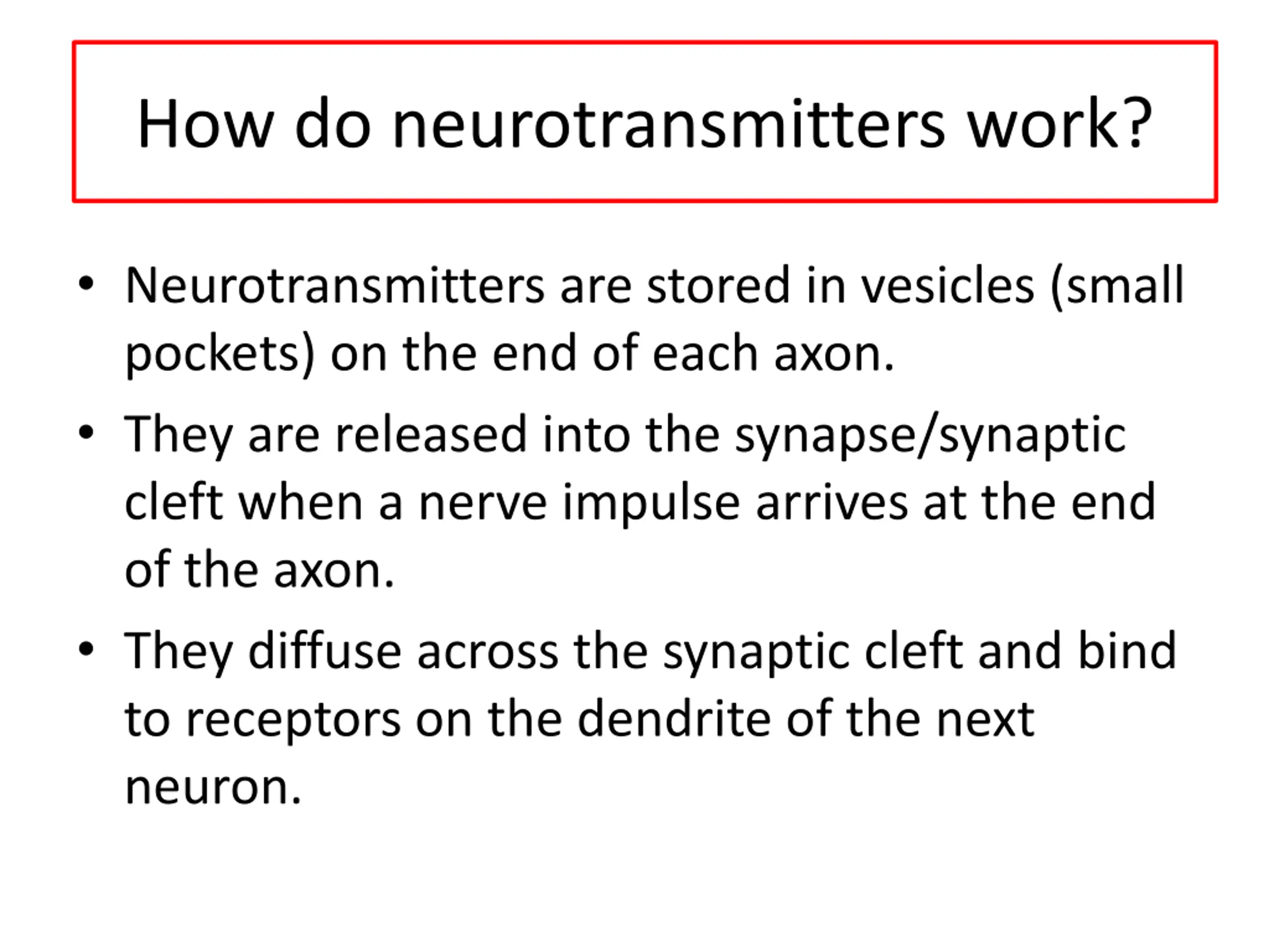 How do neurotransmitters work? Neurotransmitters are stored in vesicles (small pockets) on the end of each axon. They are released into the synapse/synaptic cleft when a nerve impulse arrives at the end of the axon. They diffuse across the synaptic cleft and bind to receptors on the dendrite of the next neuron.