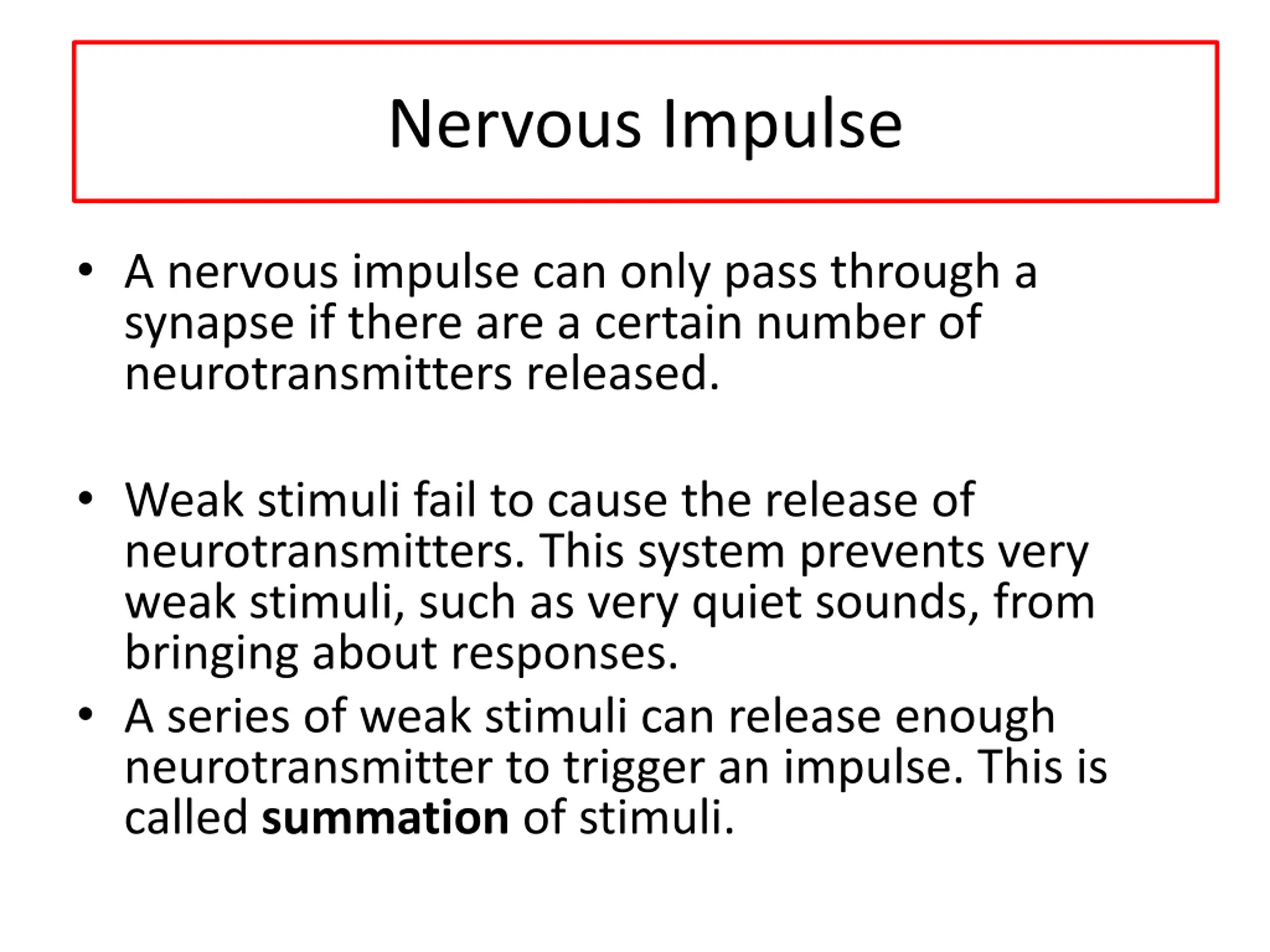 Nervous Impulse A nervous impulse can only pass through a synapse if there are a certain number of neurotransmitters released. Weak stimuli fail to cause the release of neurotransmitters. This system prevents very weak stimuli, such as very quiet sounds, from bringing about responses. A series of weak stimuli can release enough neurotransmitter to trigger an impulse. This is called summation of stimuli.