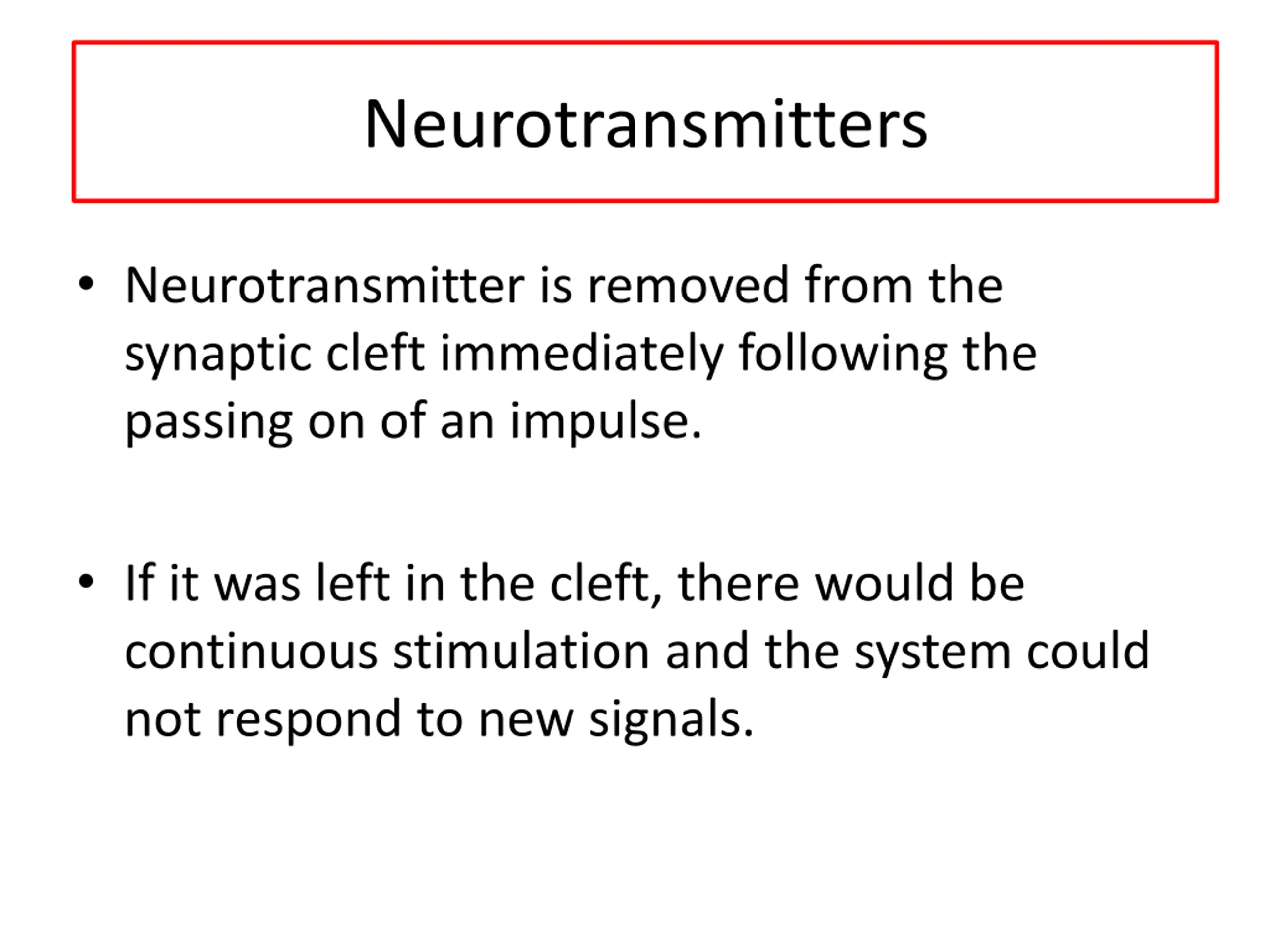 Neurotransmitters Neurotransmitter is removed from the synaptic cleft immediately following the passing on of an impulse. If it was left in the cleft, there would be continuous stimulation and the system could not respond to new signals.