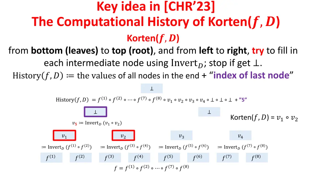 Key idea in [CHR23] The Computational History of Korten(?,?) Korten(?,?) from bottom (leaves) to top (root), and from left to right, try to fill in each intermediate node using Invert?; stop if get . History ?,? the values of all nodes in the end + index of last node History ?,? = ?(1) ?(2) ?(7) ?(8) ?1 ?2 ?3 ?4 + 5 Korten(?,?) = ?1 ?2 ?? Invert? (?1 ?2) ?1 ?2 ?3 ?4 Invert? (?1 ?(2)) Invert? (?3 ?(4)) Invert? (?5 ?(6)) Invert? (?7 ?(8)) ?(1) ?(2) ?(3) ?(4) ?(5) ?(6) ?(7) ?(8) ? = ?(1) ?(2) ?(7) ?(8)